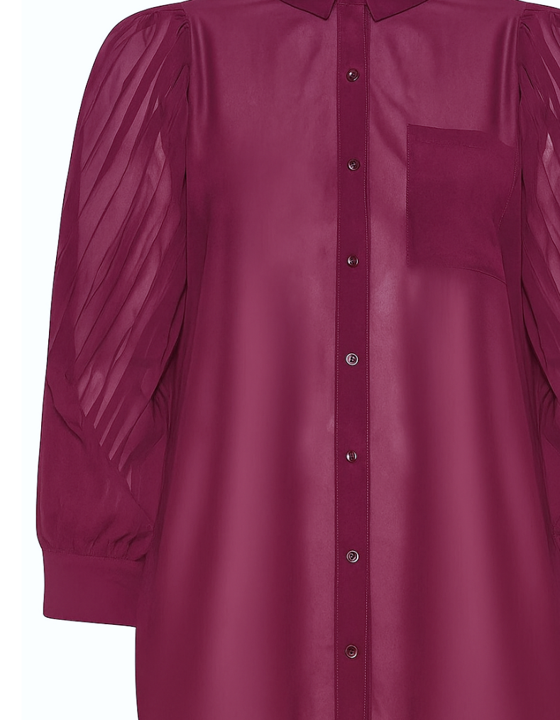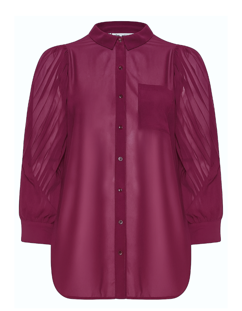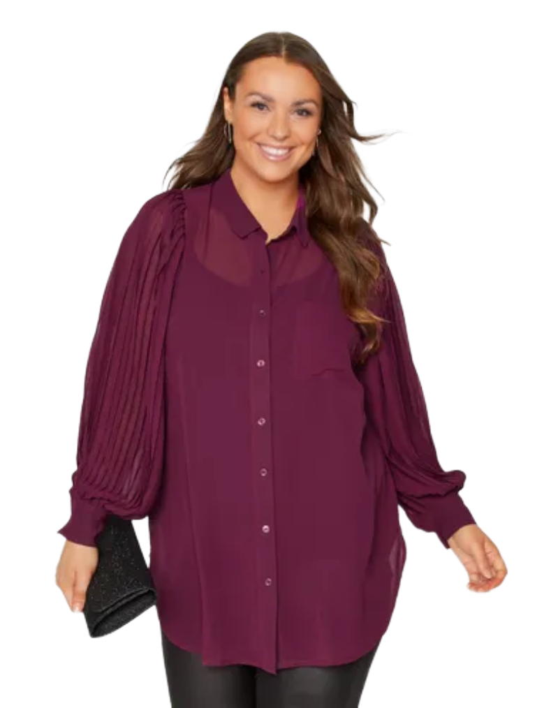 Elevate your evening wardrobe with this Women's Plus Size Long Pleat Sleeve Shirt in Berry Purple. Crafted from a soft, breathable mesh fabric, it features a timeless classic collar and elegant pleat detail sleeves that add subtle sophistication. The button-through fastening ensures a polished finish, making it ideal for pairing with leather-look trousers and heels for a striking, confident look. Designed to blend comfort with refined style, this shirt is a versatile addition that enhances your outfit with ease and grace.