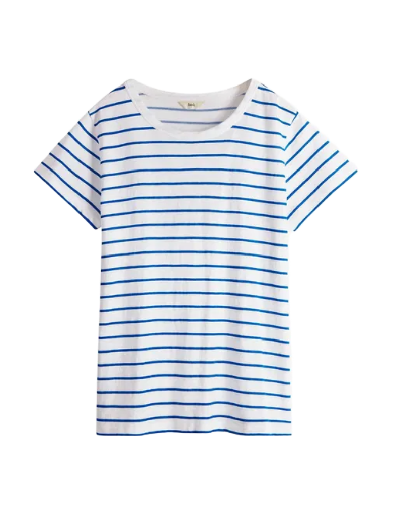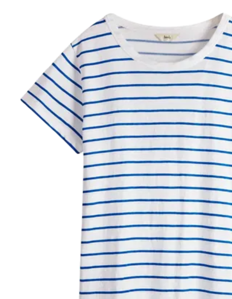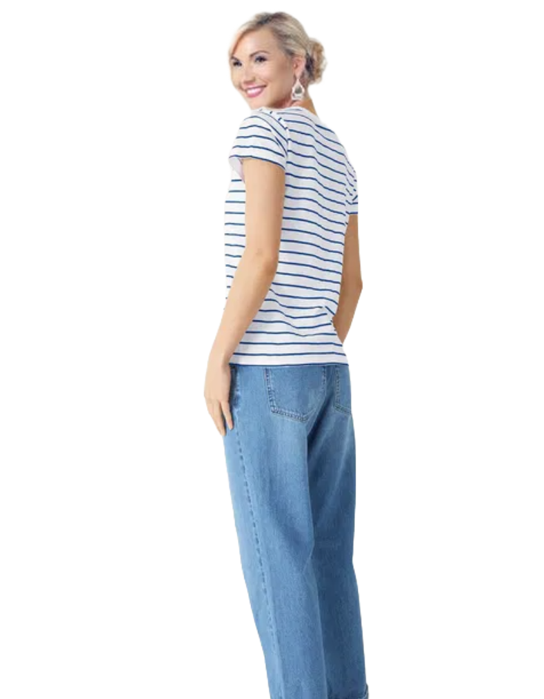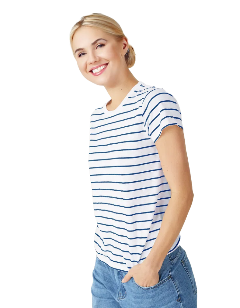 Elevate your wardrobe with our Women's Short Sleeve Slim Fit Stripe T-Shirt in Blue White. Made with soft, breathable cotton and a slim fit, it's the perfect layering piece for any outfit. From jeans to midi skirts, this versatile tee is a must-have for any fashionista.