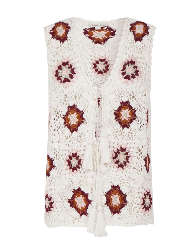 Embrace bohemian elegance with this sustainable cotton crochet waistcoat, crafted from 100% eco-conscious materials. Featuring a sleeveless, round-neck silhouette with a pull-on fit, this piece layers beautifully over blouses, bikini tops, or bare skin for an effortlessly relaxed look. The delicate floral crochet detailing, tie front, and playful fringe trim deliver authentic beachy textures perfect for festivals and holidays. Easy machine care keeps this versatile staple ready for your next adventure.