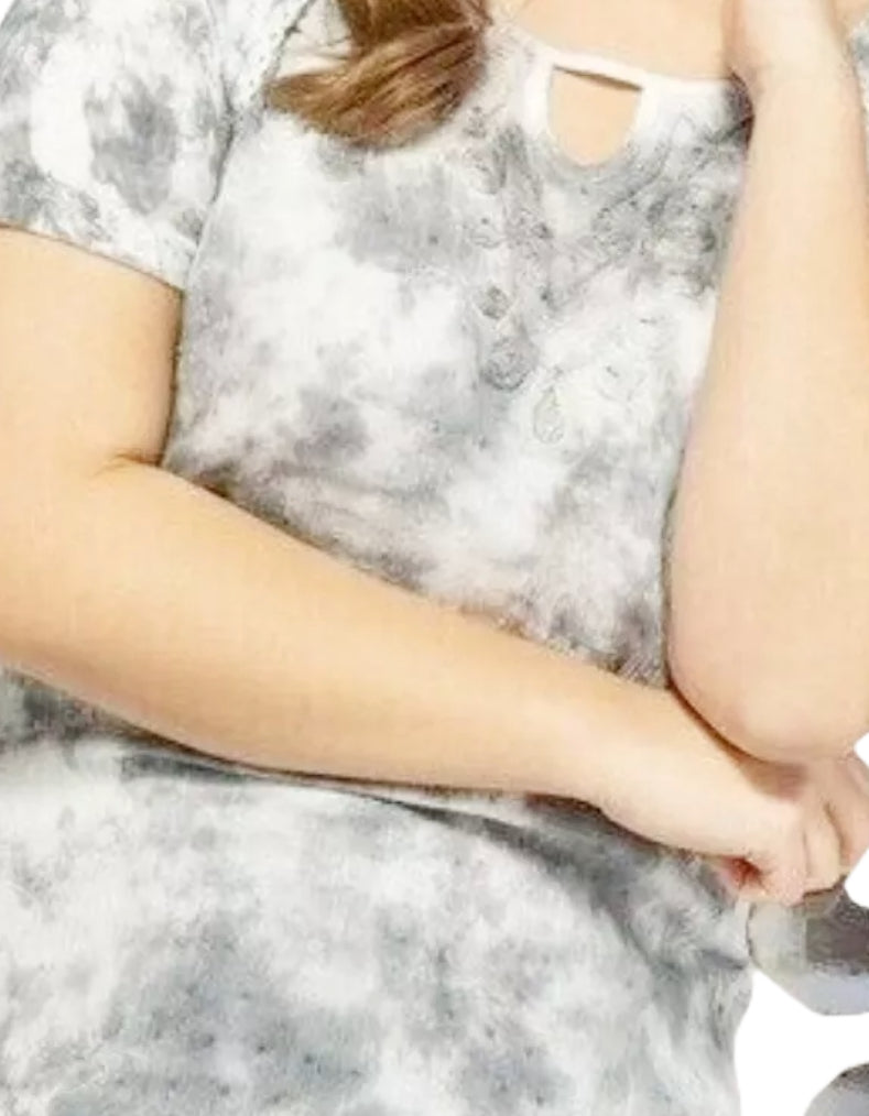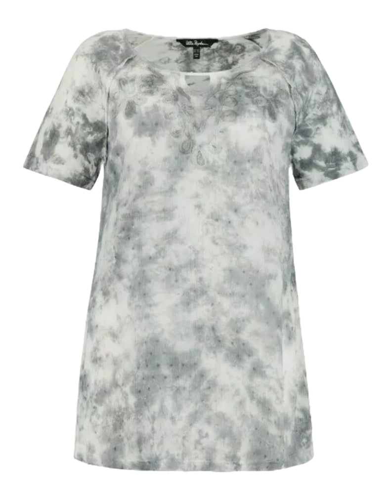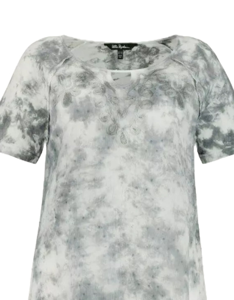 Elevate your summer wardrobe with this expertly crafted women's short sleeve top in grey. Featuring a distinctive tie dye pattern and delicate embroidered sleeves, it combines unique style with breathable comfort. Perfect for warm days, this top offers a refined yet relaxed look that enhances any casual outfit.