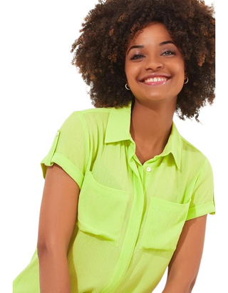 Women's Short Sleeve Patch Pocket Collared Shirt Blouse in Lime