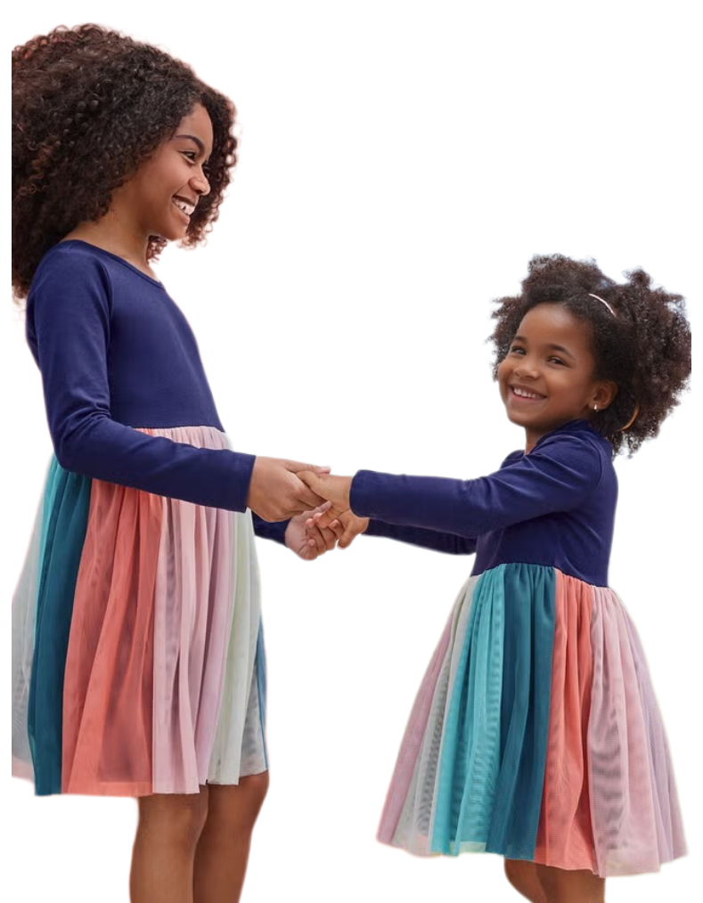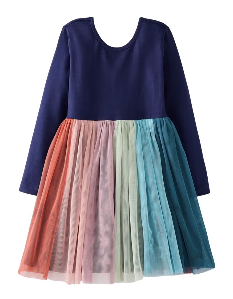 This girl's long sleeve rainbow dress in navy combines stretch jersey with soft, machine-washable tulle for comfort and durability. Designed for active play, it offers lasting quality and a vibrant, dreamy look that stands up to everyday wear. Perfect for adding a touch of magic to any occasion.