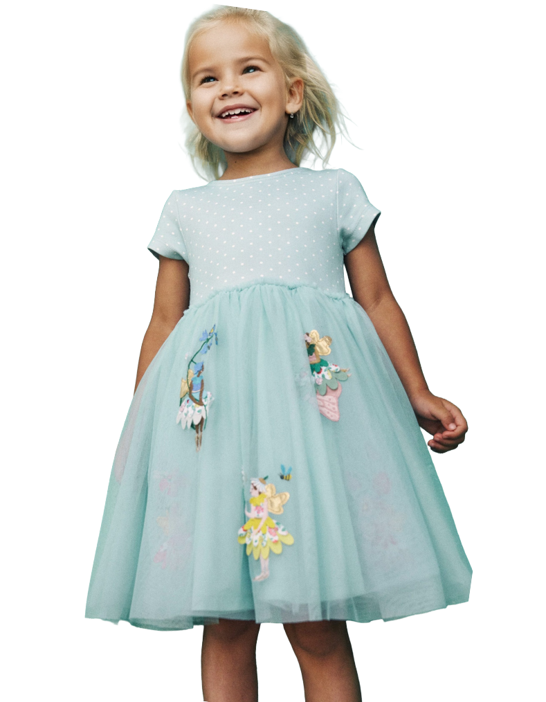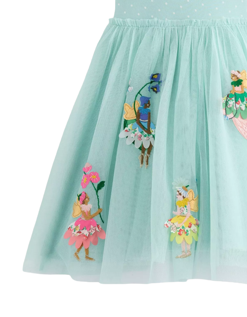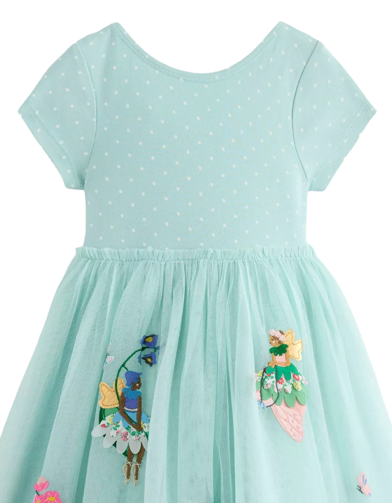 Mini Boden Girl's Ami Applique Tulle Dress in Spearmint Blue Flower Fairies