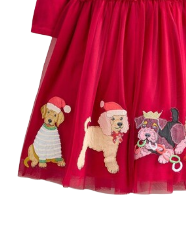 This Mini Boden girl's dress combines plush velvet with delicate tulle and intricate appliqués, creating a festive look perfect for holiday celebrations. Its rich red hue and elegant design make it ideal for dancing and special occasions, ensuring comfort and style throughout the party.