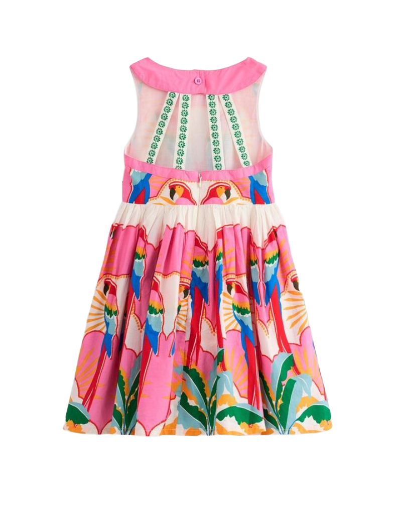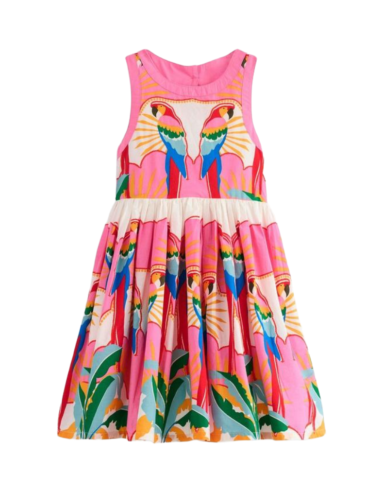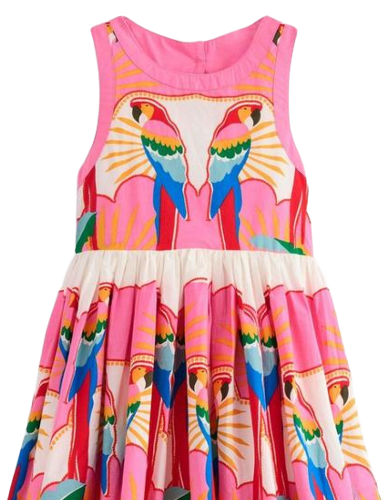 Designed for seaside adventures, the Mini Boden Girl's Harlow Cotton Dress features a fitted bodice with distinctive back straps and a full, swishable skirt. Crafted from breathable cotton, it ensures comfort while exploring sandy shores or collecting seashells, combining practical design with playful style.