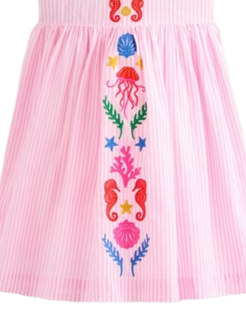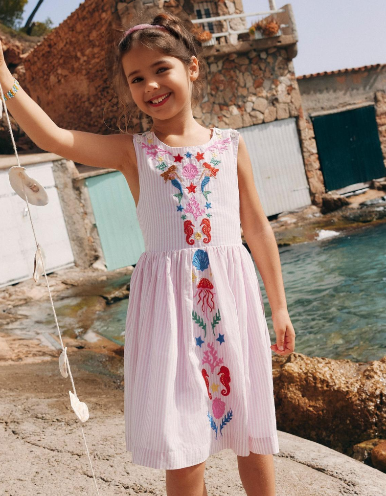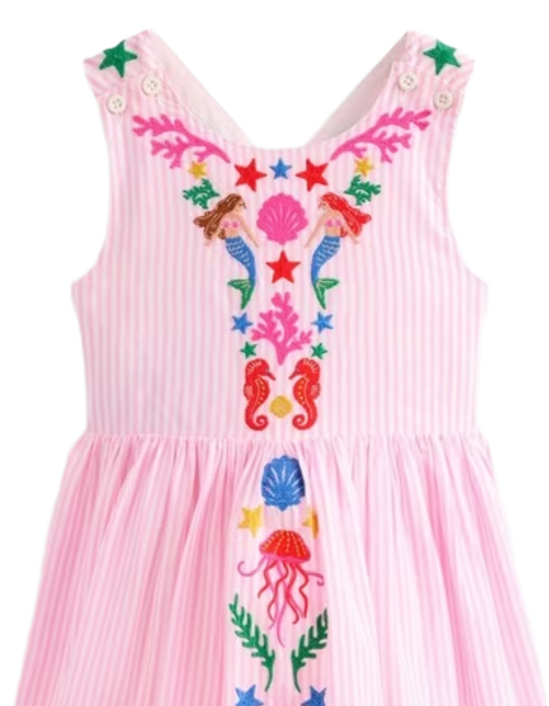 The Mini Boden Girl's Harper Cotton Embroidered Cross-Back Dress in Pink Mermaid combines comfort and style with its elasticated crossover straps that ensure a secure fit during active play. Crafted from soft cotton, this dress features delicate embroidery and a playful pink mermaid hue, making it an ideal choice for springtime adventures. Its thoughtful design supports freedom of movement while maintaining a neat silhouette.