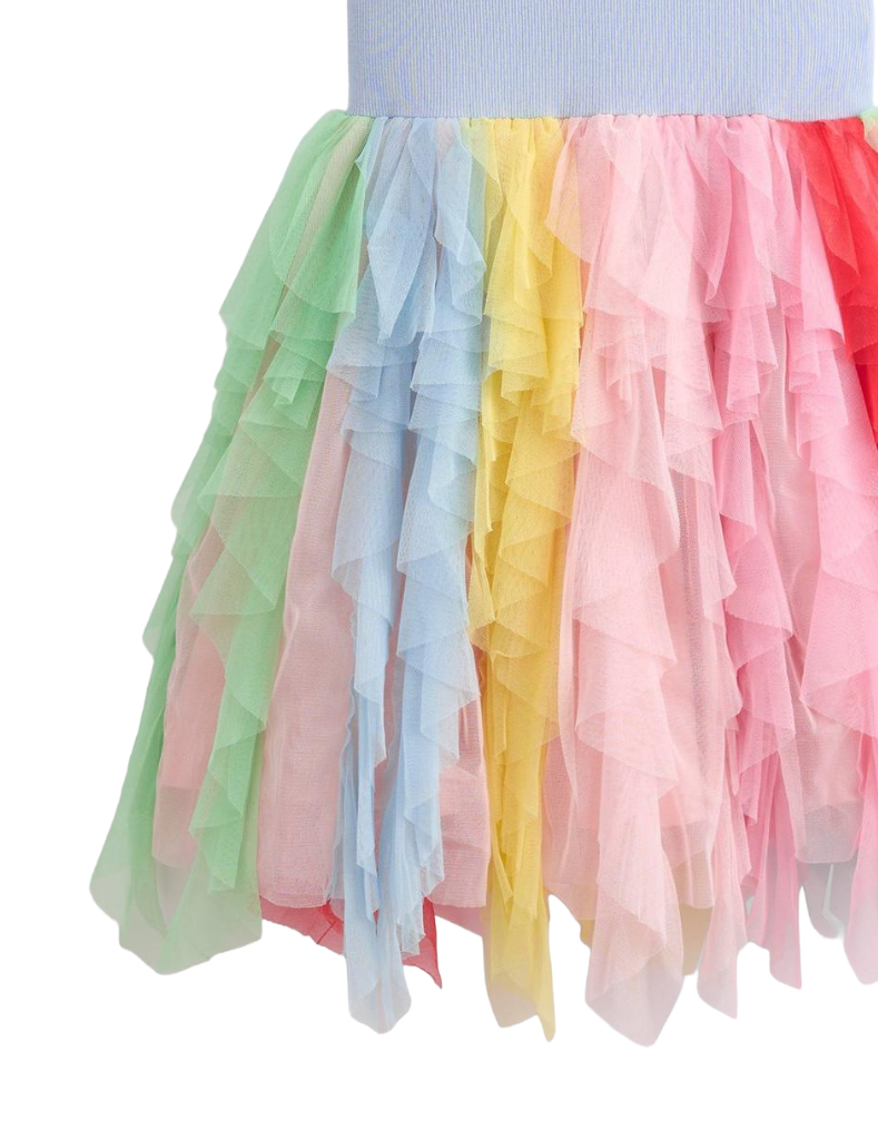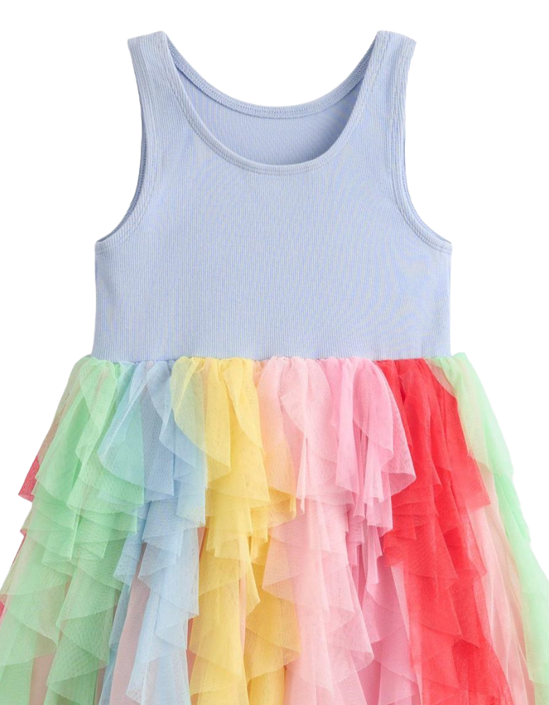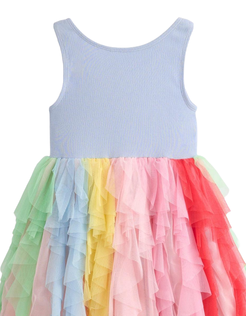 This Mini Boden girl's dress combines comfort and whimsy with a soft jersey top and an extra-full tulle skirt. The breathable jersey fabric ensures ease of movement, while the voluminous tulle design invites playful twirling. Finished in a misty blue hue with subtle rainbow detailing, it balances practicality with enchanting style for everyday wear or special occasions.