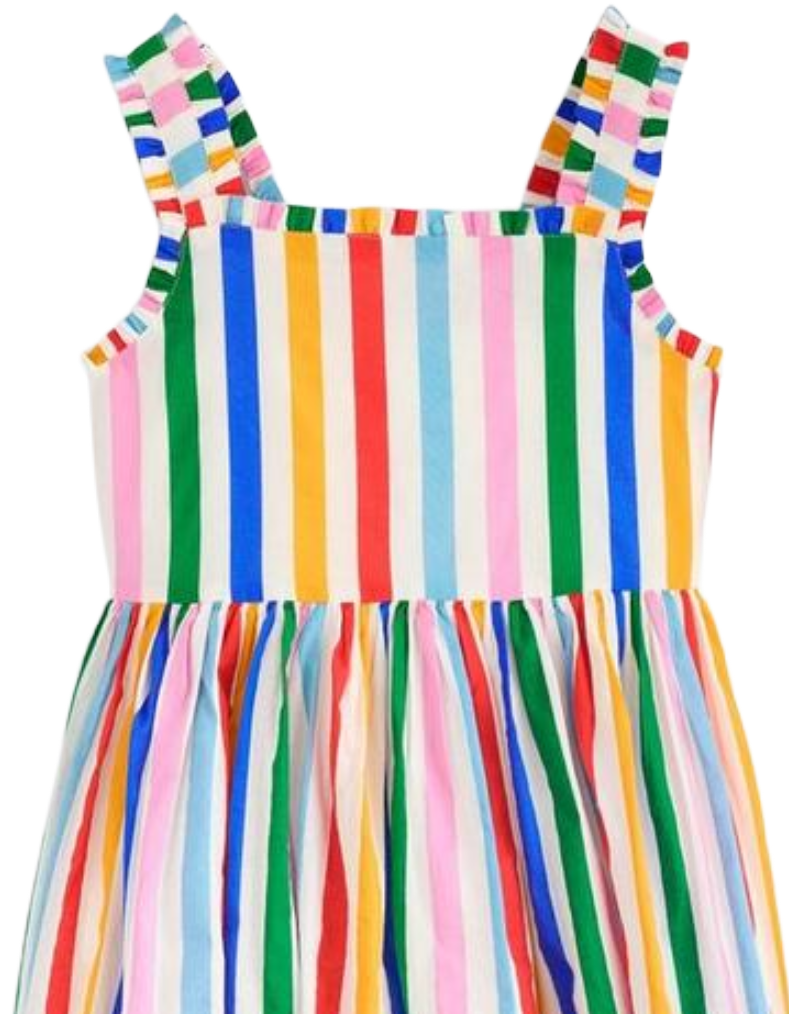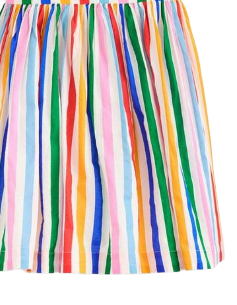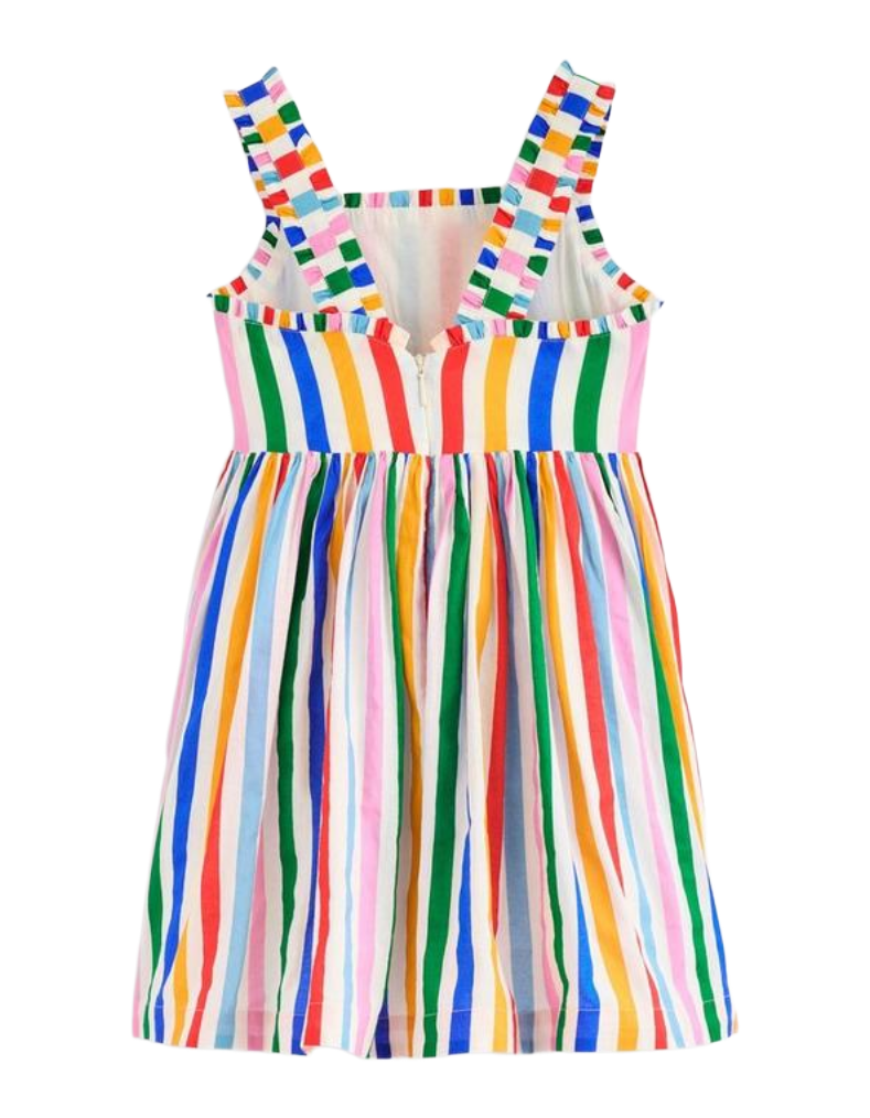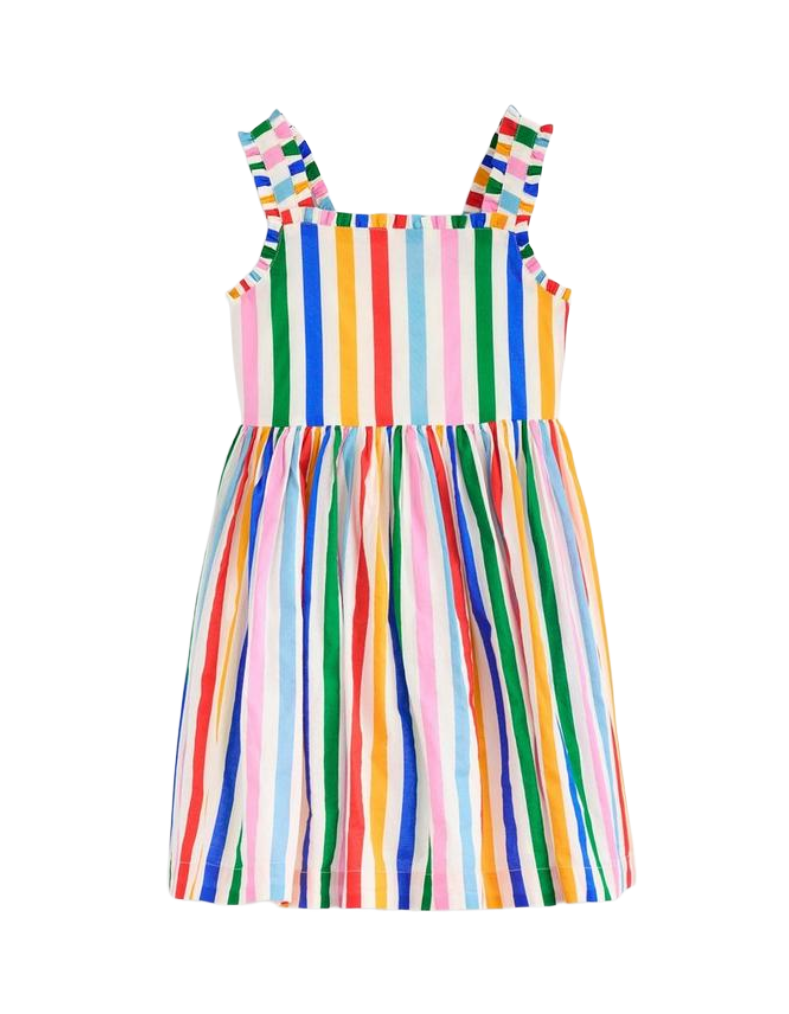 The Mini Boden Girl's Luna Frill Strap Woven Dress combines playful design with expert craftsmanship. Featuring delicate frilly straps and a full skirt adorned with vibrant, multi rainbow stripes, this dress brings cheerful style perfect for sunny days. Its lightweight fabric ensures comfort while encouraging twirls and movement, making it an ideal choice for active little girls. Bright, summery prints add a joyful touch that effortlessly blends fun and sophistication.