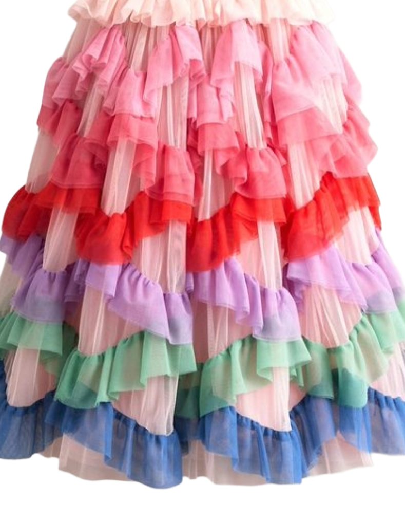 This Mini Boden Girl's Maude Ruffle Tulle Dress in Pink Rainbow captivates with its festive flair, featuring tiered tulle adorned with metallic gold stars. The delicate bauble-like pompoms add a playful, holiday-inspired touch, making it an elegant yet fun choice for seasonal celebrations. Crafted for comfort and style, this dress offers a standout look perfect for special occasions.