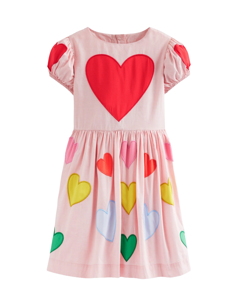 This Mini Boden Girl's Puff Sleeve Heart Dress in Light Pink Hearts features charming rainbow hearts, soft puffed sleeves, and a large bow sash that adds a delightful touch. Designed with a voluminous skirt, it encourages twirling and playful movement, making it an ideal choice for joyful occasions. Crafted to combine comfort and style, this dress suits young girls looking for both fun and a polished look.