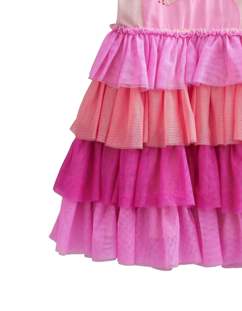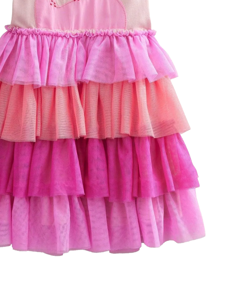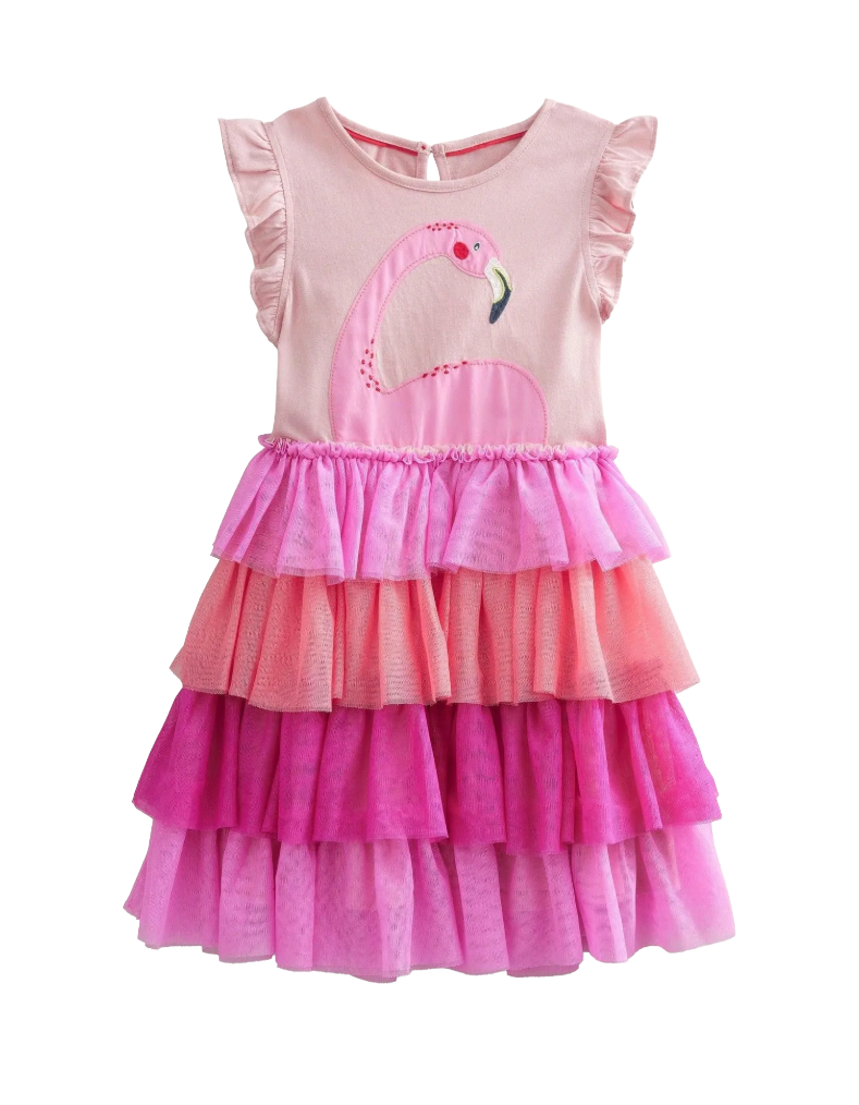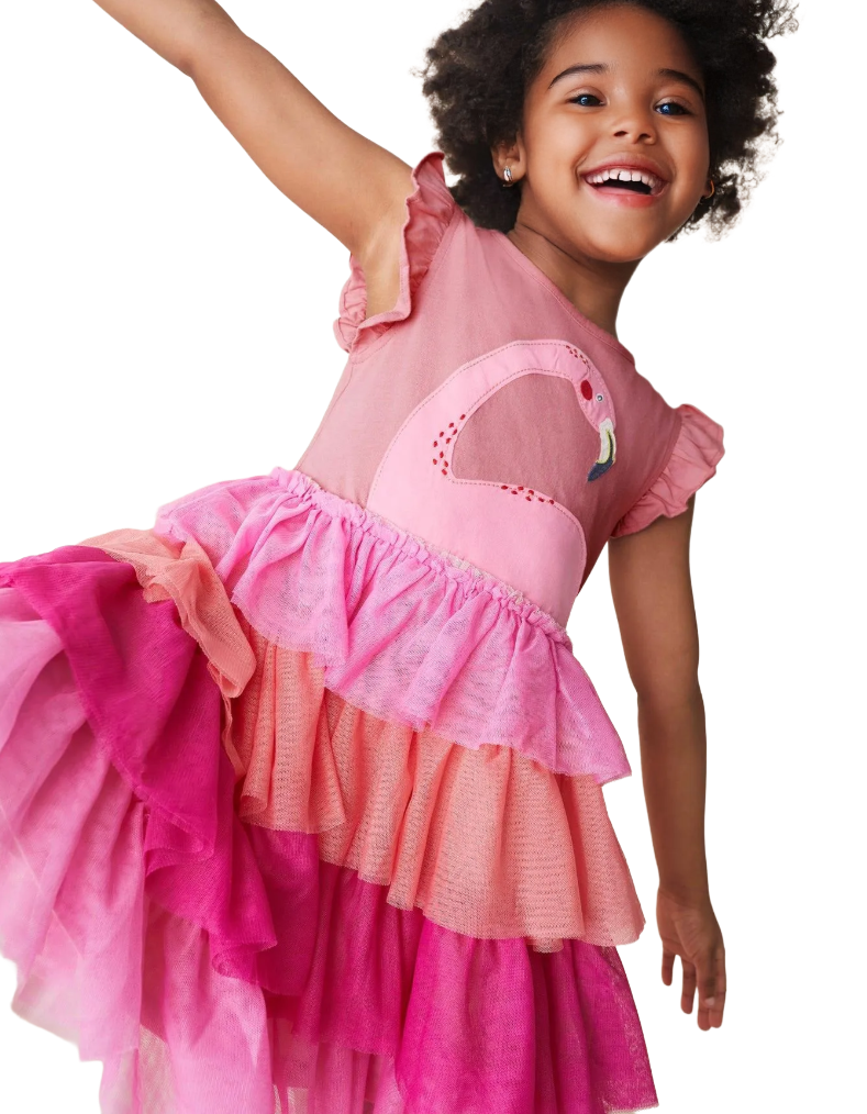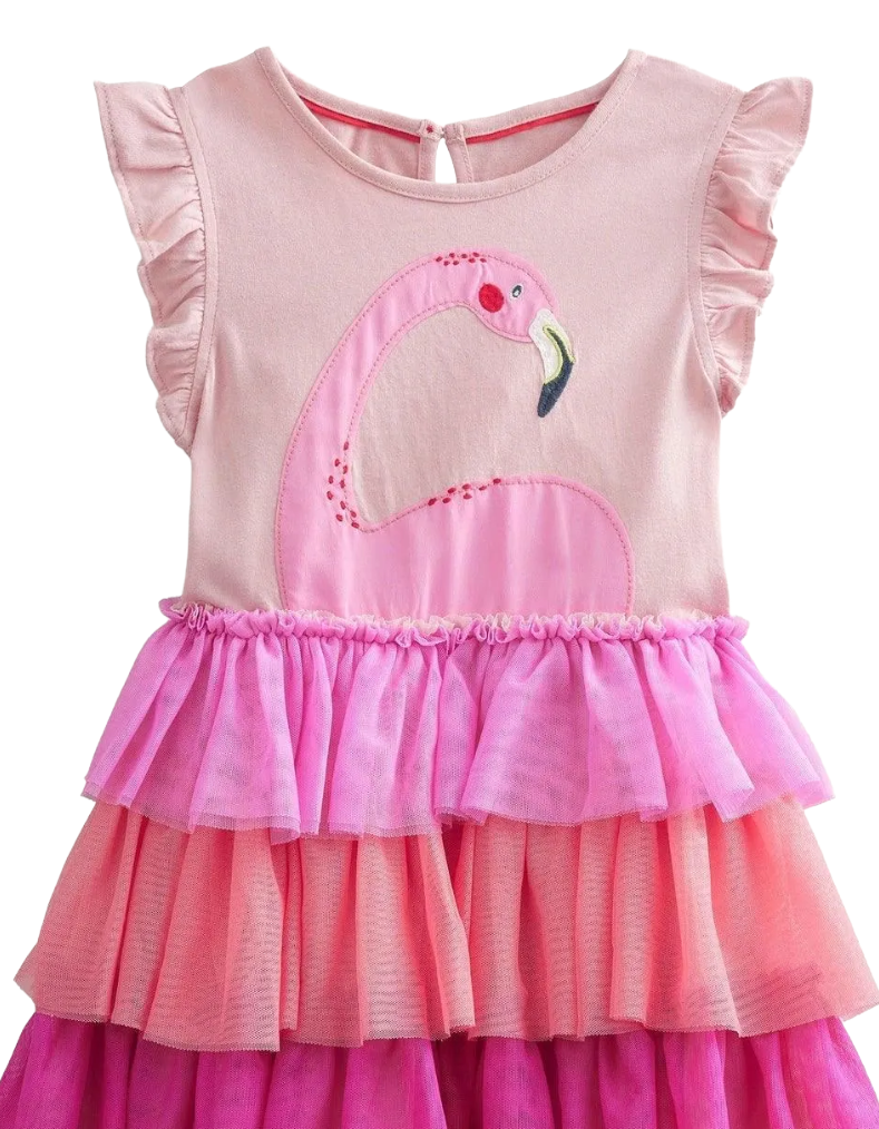 This Mini Boden girl's sleeveless dress features a delicate pink tulle fabric adorned with charming flamingo appliqués and soft ruffle details. Designed for comfort and style, it offers a lightweight, breathable fit perfect for warm weather or special occasions. The intricate appliqué work adds a playful yet refined touch, making it an excellent choice for parents seeking both quality and unique design in children's apparel.