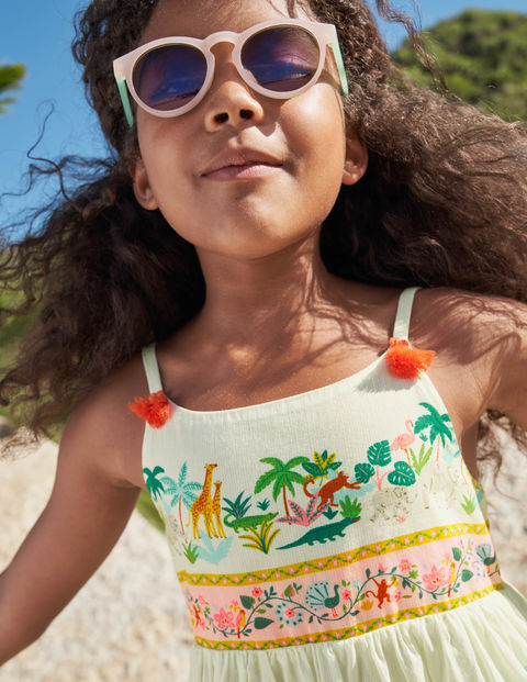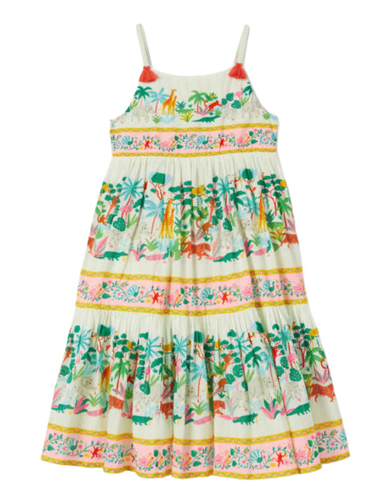 This Mini Boden girls' sundress showcases expertly designed layered tiers that enhance twirling freedom and movement. The vibrant, colorful prints add a joyful splash of colourful brightness, making every spin visually captivating. Crafted for both style and playful functionality, it offers a comfortable fit perfect for warm summer days.