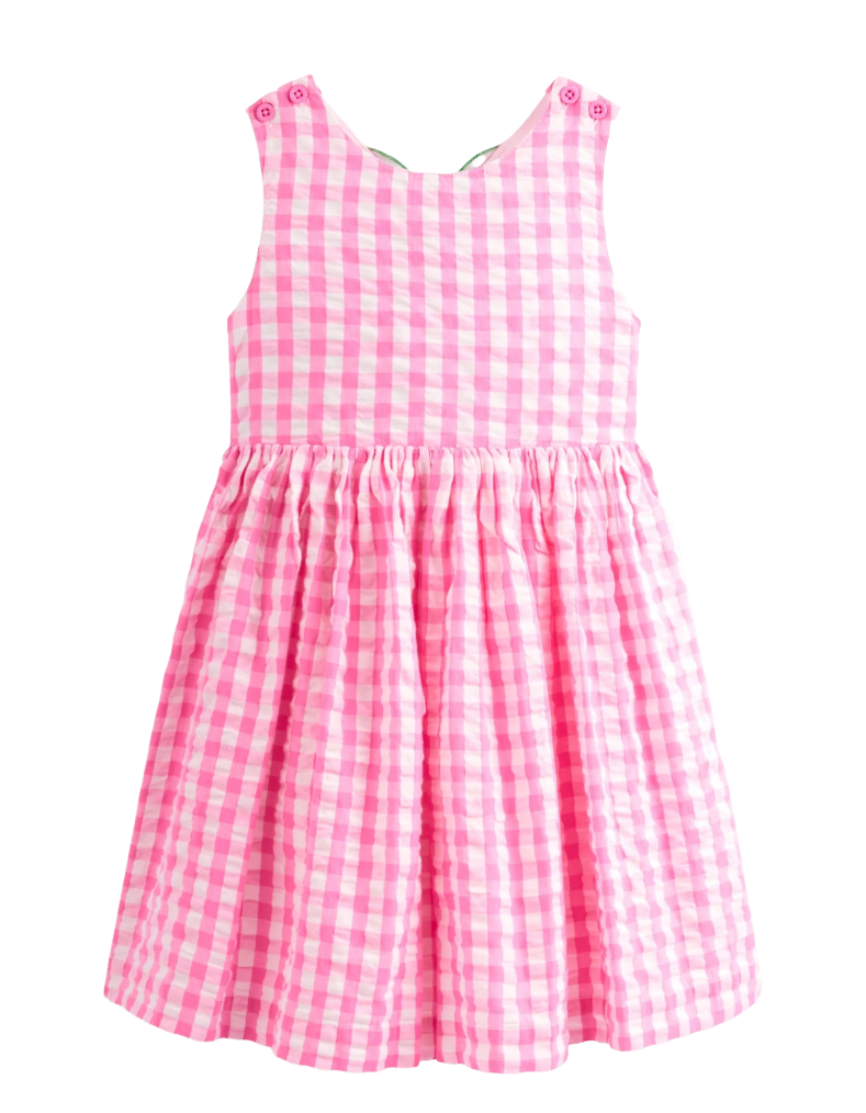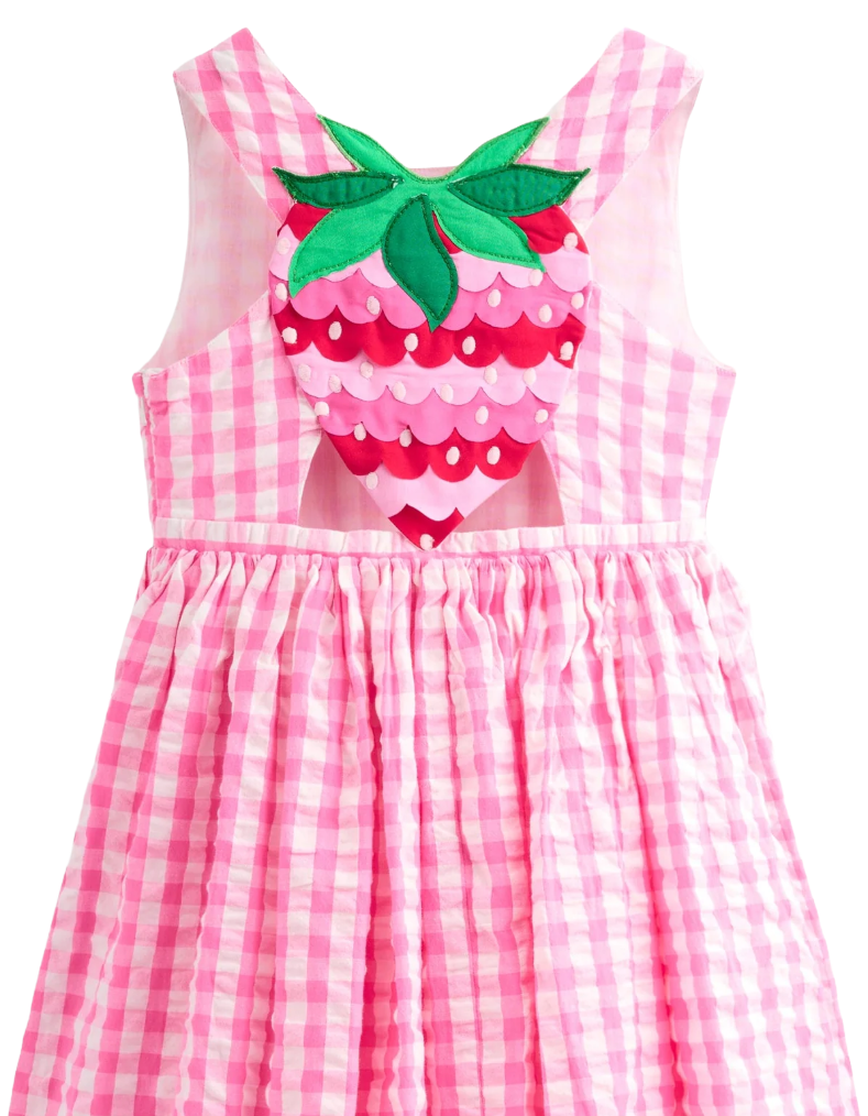 Mini Boden Girl's Zadie Applique Back Dress in Pink Gingham Strawberry