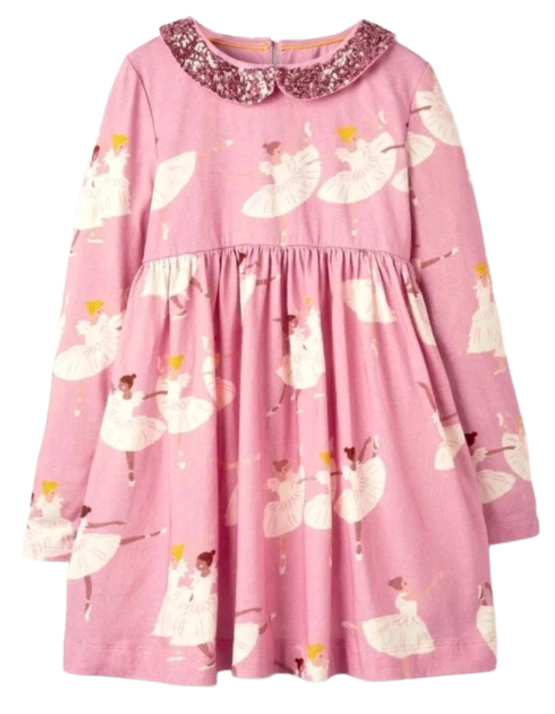 This Mini Boden party dress features a delicate ballerina print enhanced by sparkling sequins, adding a touch of glamour to any special occasion. The soft pink color and crisp collar combine classic style with modern charm, ensuring comfort and elegance for your little one. Perfect for celebrations, this dress balances playful design with expert craftsmanship.