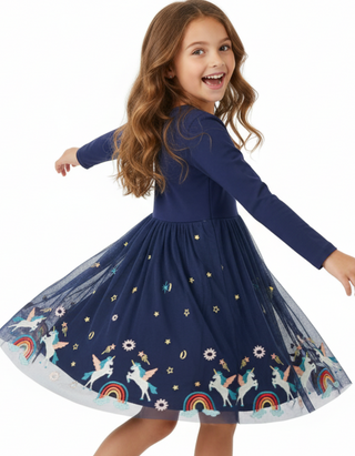 Girls' Long Sleeve Embroidered Tulle Skater Dress in Navy Unicorn (Imperfect)