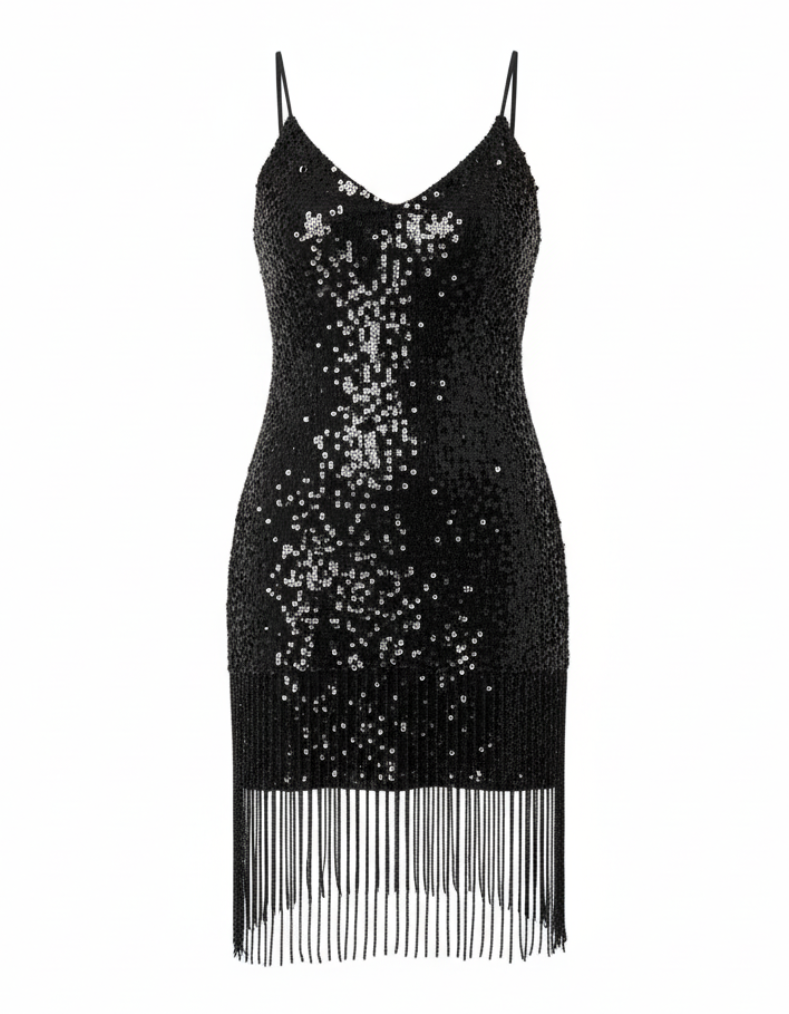 This women's mini dress in black features a slim fit silhouette designed to accentuate your shape flawlessly. Embellished with shimmering sequins, it adds a sophisticated sparkle perfect for party settings. The V-neck drop and thin straps enhance elegance, while the sleeveless design and fringe detailing at the hem provide dynamic movement and a modern edge. Ideal for evening occasions, this dress combines glamour with a sleek, contemporary style.