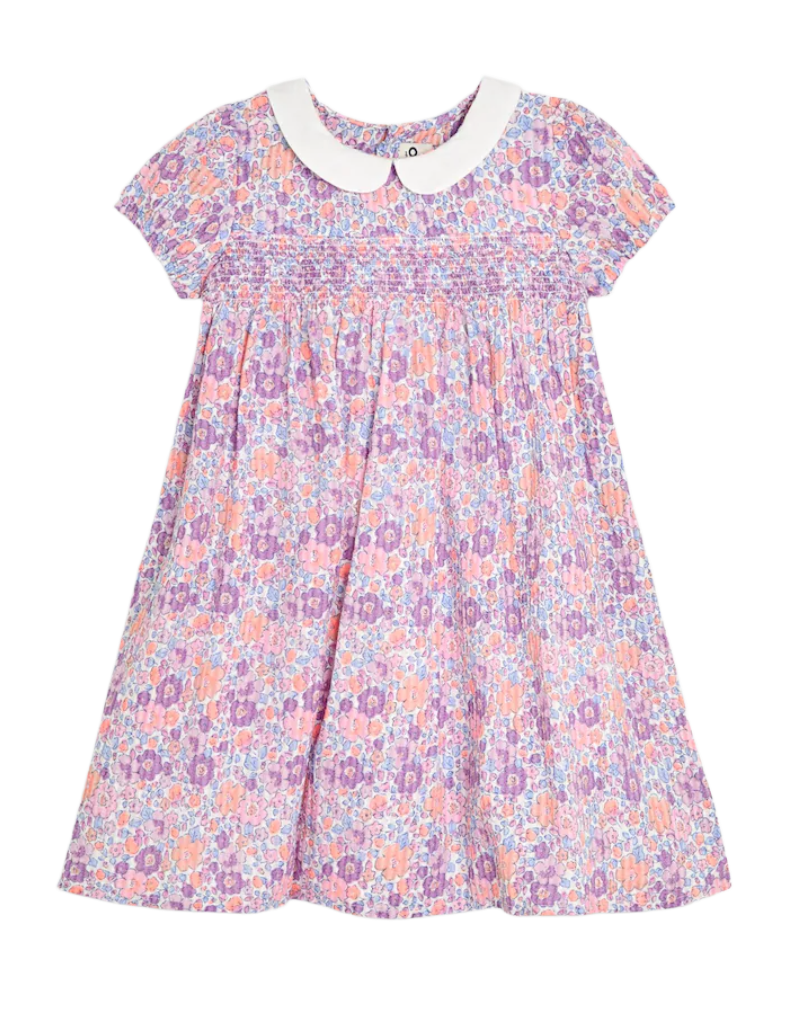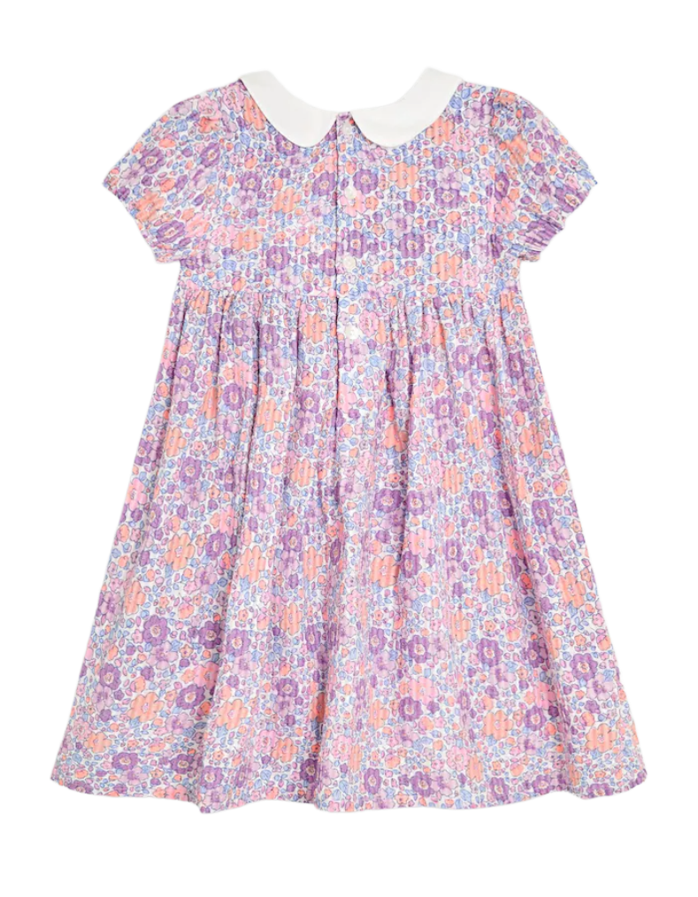 This charming lilac purple dress captures the essence of spring with its delicate tropical floral print and thoughtful design details. The smocked embroidery at the bodice creates a flattering silhouette while allowing comfortable movement for active play, whilst the crisp white Peter Pan collar adds a timeless, polished touch. Short sleeves make it ideal for warmer weather, and the included matching briefs ensure a complete, coordinated outfit. Perfect for garden parties, special occasions, or everyday wear, this dress combines classic styling with practical comfort—a versatile piece that encourages confident twirling and play.