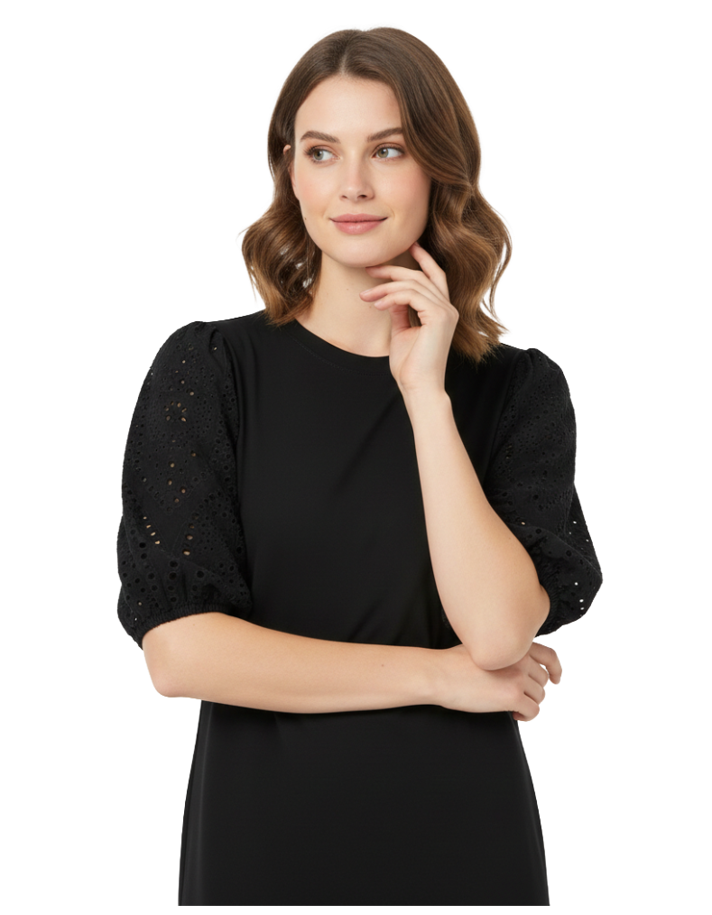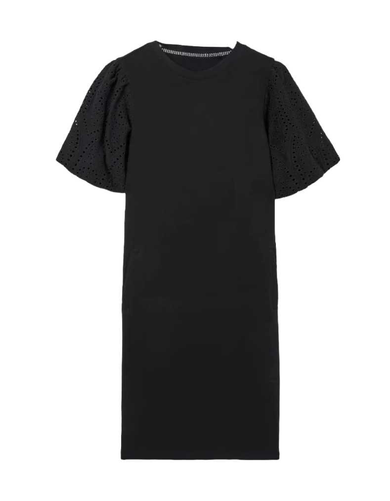 Women's Broderie Sleeve Enya Jersey Dress in Black (Imperfect)