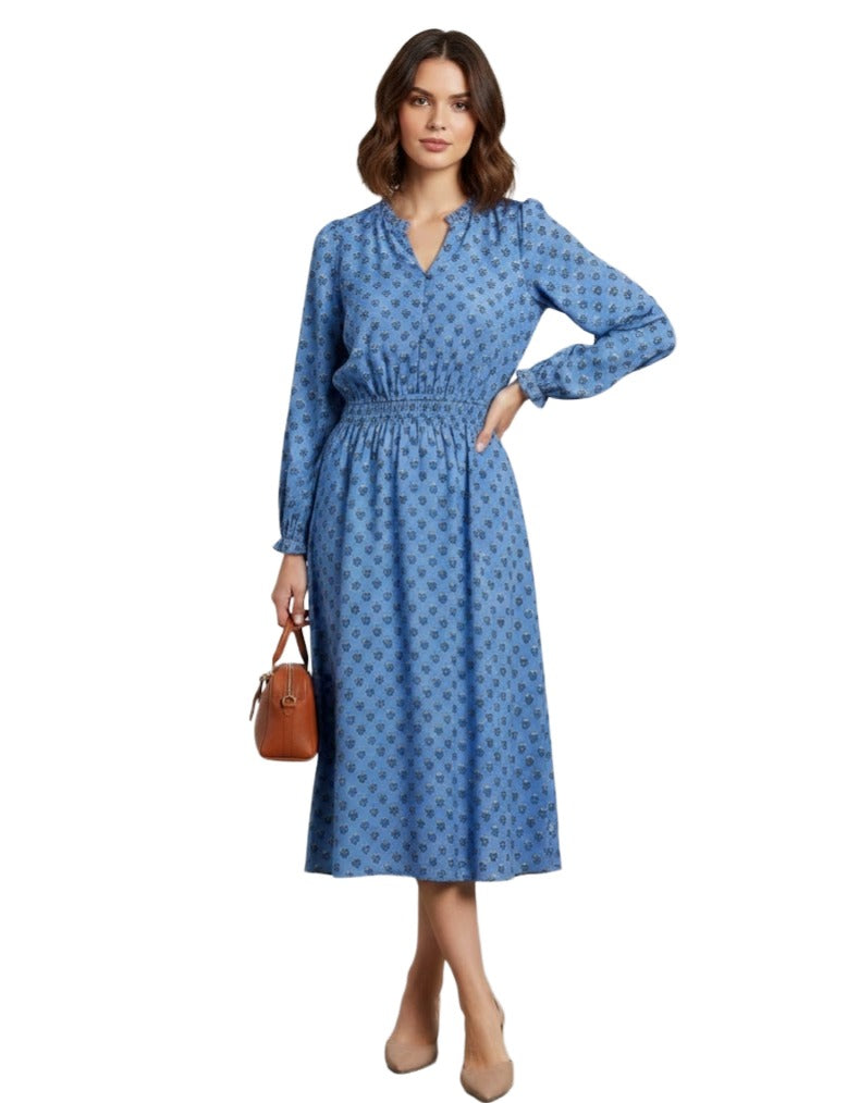 The 3/4 Sleeve V-Neck Midi Dress is sweet and swishy, featuring tumbling tiered skirts that fall just below the knee. Designed with a flattering V-neckline and a buttoned placket, this dress is perfect for all figures. Cut to just below empire length, it boasts a beautiful original print that exudes effortless style. Ideal for sunny days, simply slip it on and pair with a denim jacket and sneakers for a trendy, youthful look. Perfect for both casual outings and special moments!
