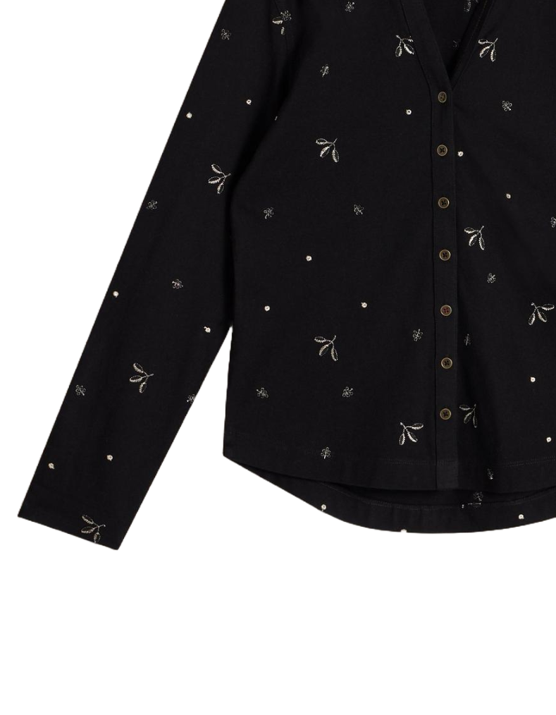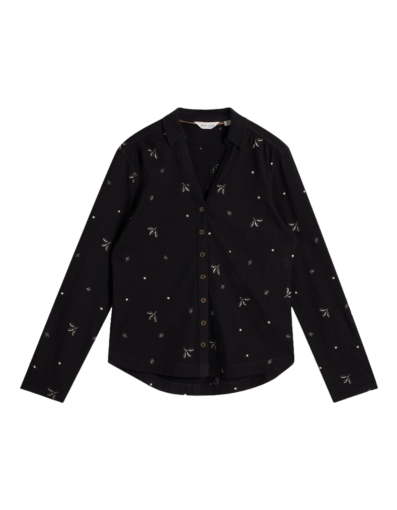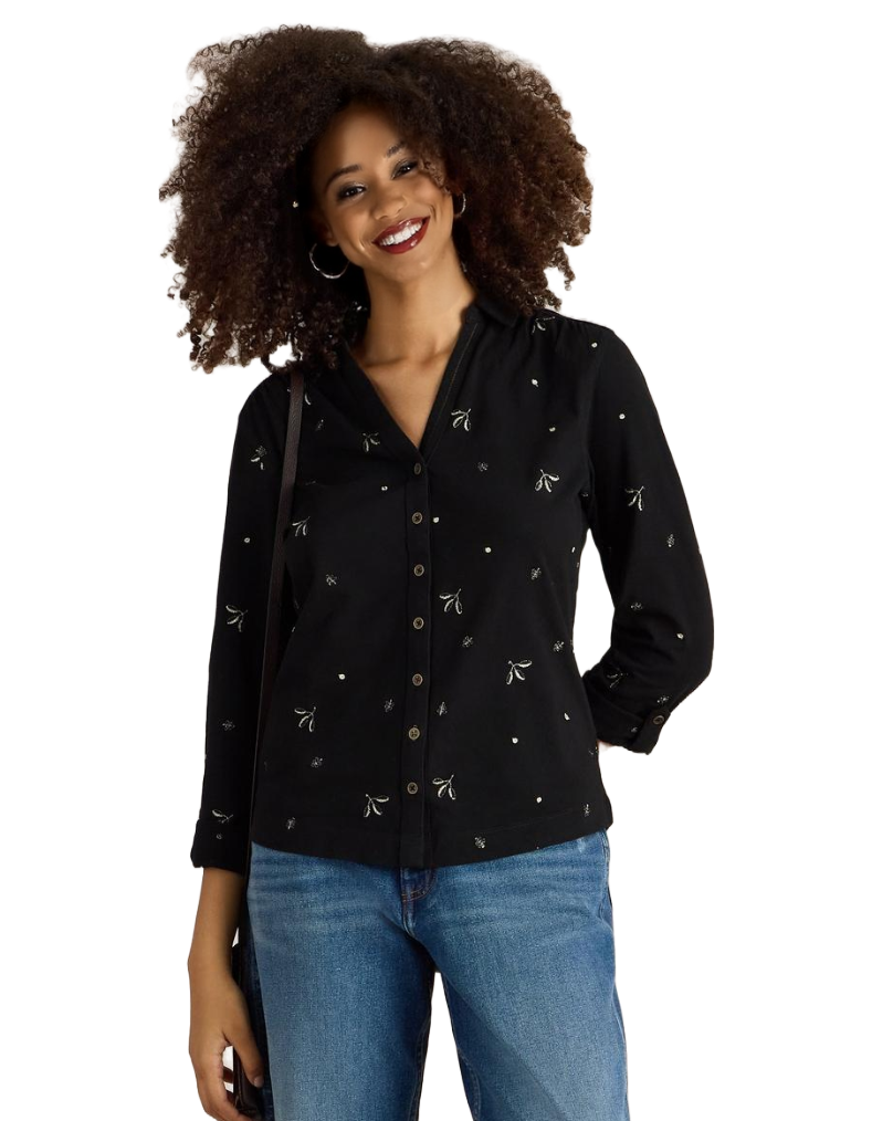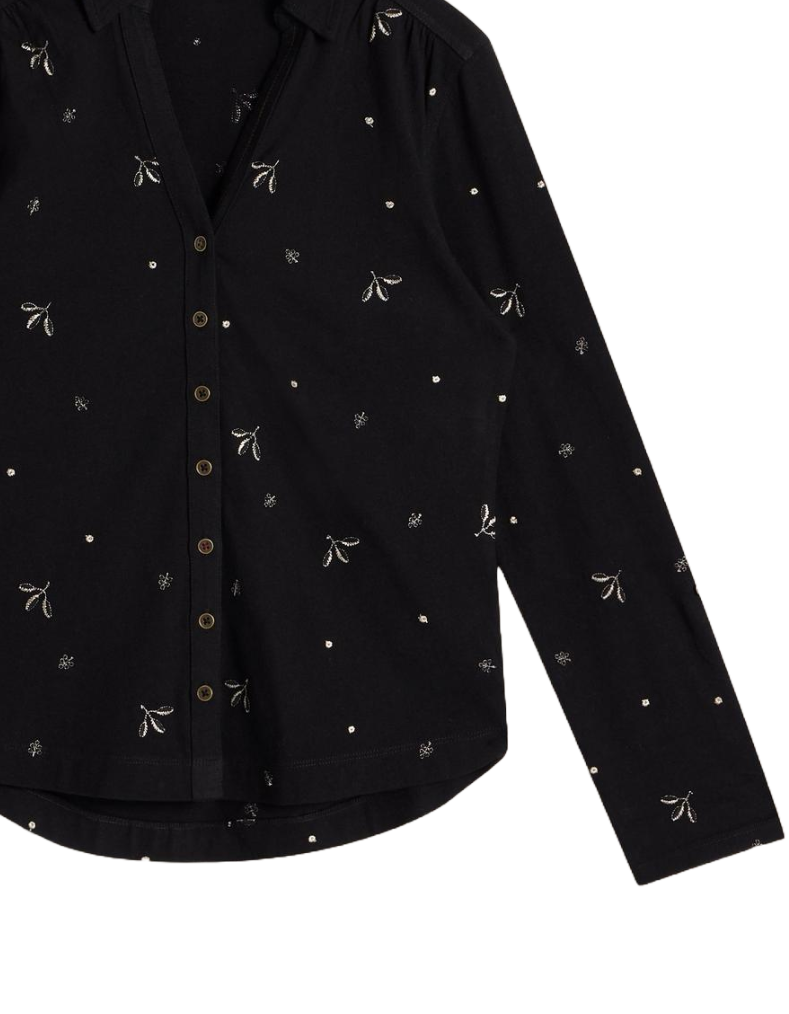 Stay stylish and comfortable with the Women's Annie Embroidered Collared Shirt. Made of soft jersey fabric, this shirt features elegant embroidery for a touch of sophistication. Perfect for both day and night wear, you'll never want to take it off.