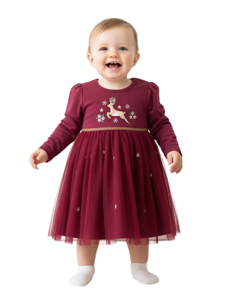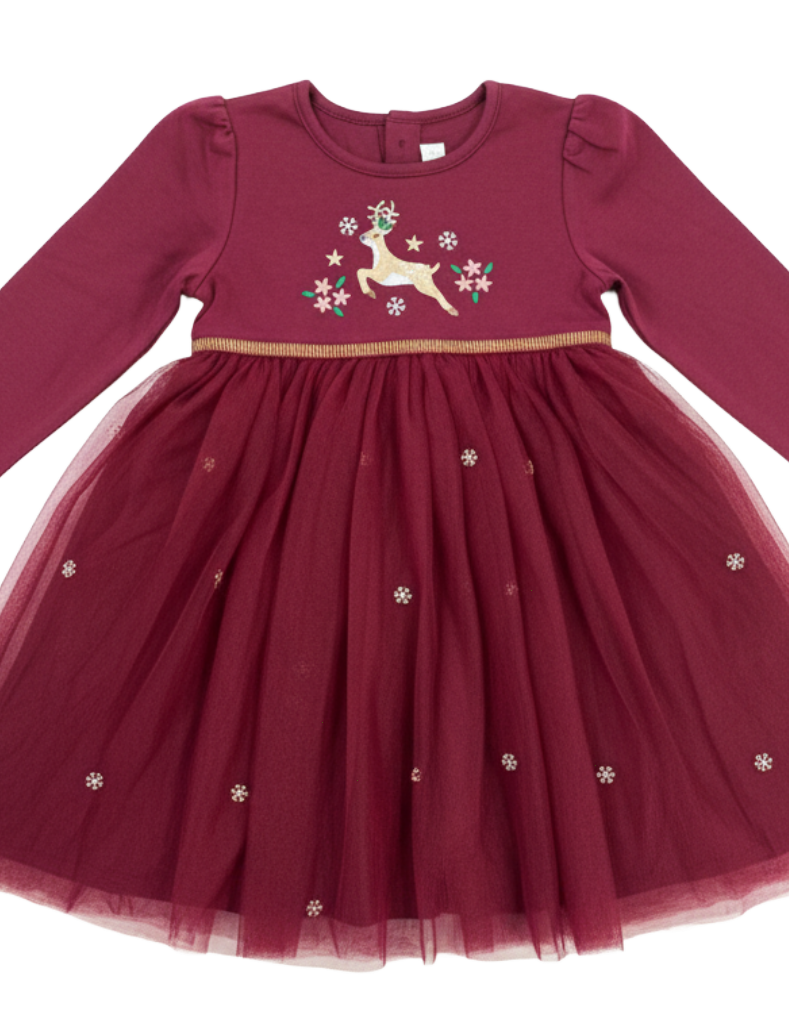 A charming tulle dress featuring an adorable deer applique design, perfect for special occasions or everyday elegance. Crafted in soft berry pink, this JoJo Maman piece combines playful style with quality construction. The delicate tulle fabric creates a graceful silhouette while the whimsical bunny detail adds personality and charm. Ideal for young girls who appreciate thoughtful design and comfort in their wardrobe.