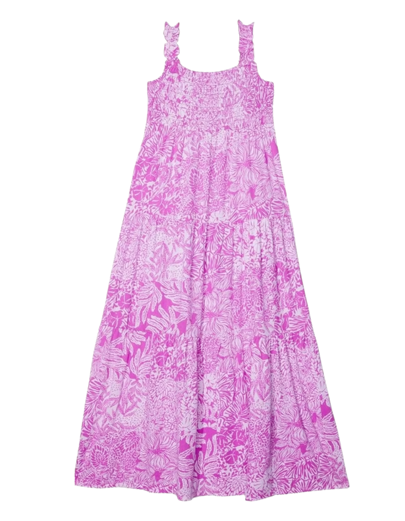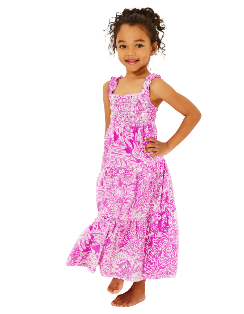 Your mini will love this maxi! Crafted from soft 100% cotton jersey, the Mini Hadly Maxi Dress combines comfort with playful style. The smocked bodice provides gentle shaping, while ruffled elastic straps and a tiered ruffle skirt create movement and charm. Perfect for warm days and special occasions. Machine wash cold on delicate cycle, separately.