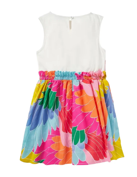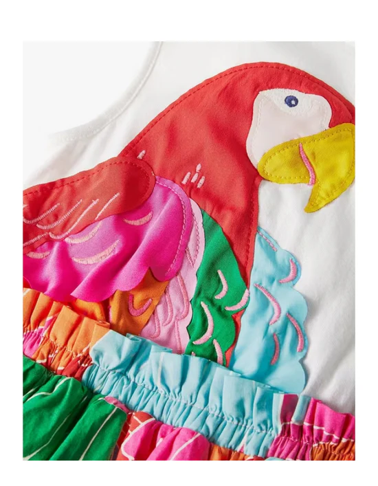 Crafted from pure cotton, this Mini Boden girls' dress features a striking appliqué parrot with 3D textured threads that add dynamic detail to the animal-themed design. The ruffle at the waist elegantly divides the embellished top from the boldly patterned skirt, creating a balanced and playful silhouette. Ideal for warm days, this dress pairs effortlessly with simple pumps, combining comfort and style in a refined way suitable for any casual outing.