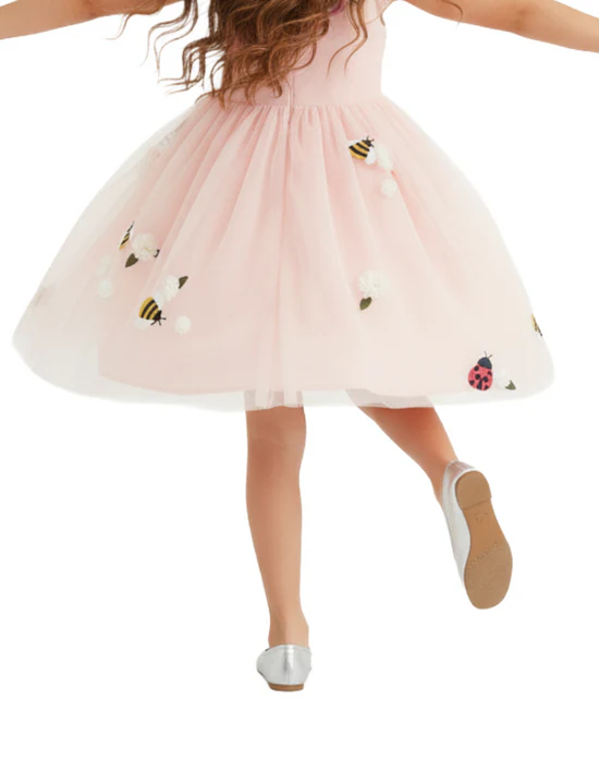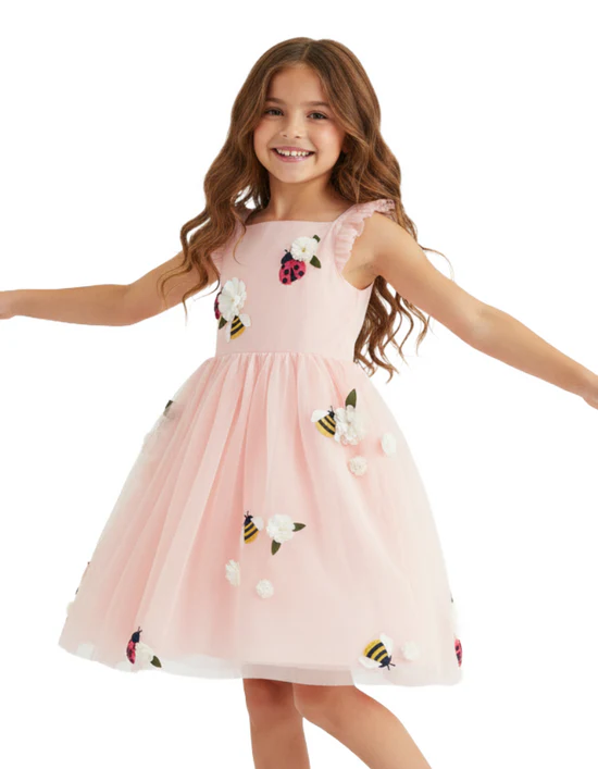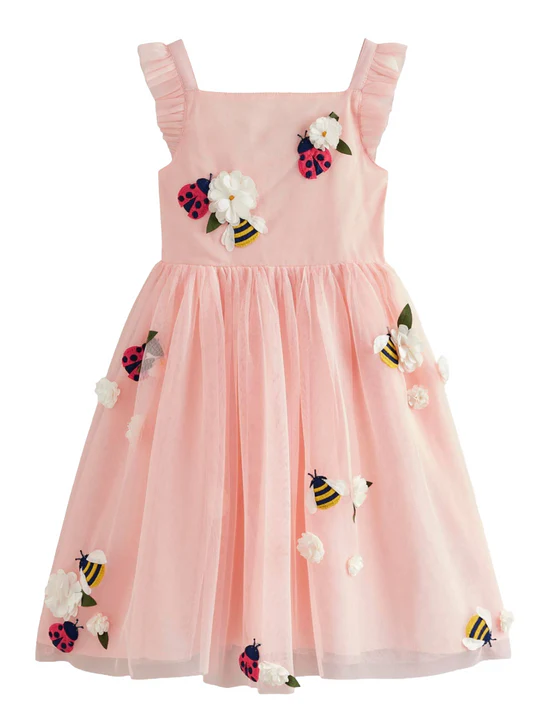 This Mini Boden girls' dress in pastel blue features a gathered full tulle skirt adorned with delicate appliqué flowers that add graceful movement. The design includes a flattering square neckline and flutter straps for a charming silhouette, while the shirred back panel ensures a comfortable, secure fit. Ideal for special occasions, this dress combines elegant details with comfort for lasting wear.