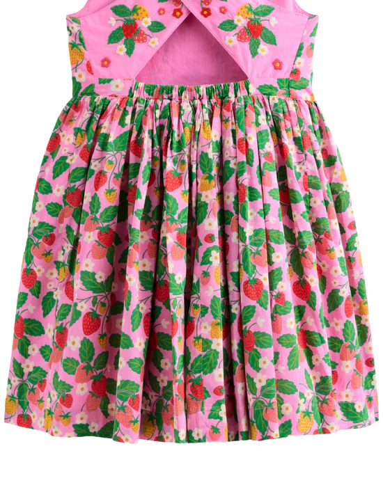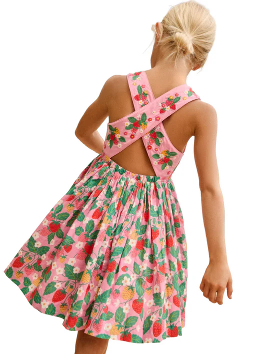 Mini Boden Girl's Harper Cross-Back Dress in Cosmos Pink Strawberry Patch (Imperfect)