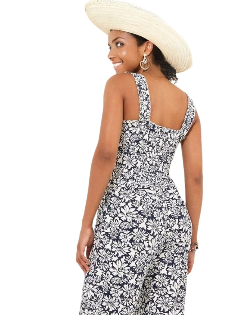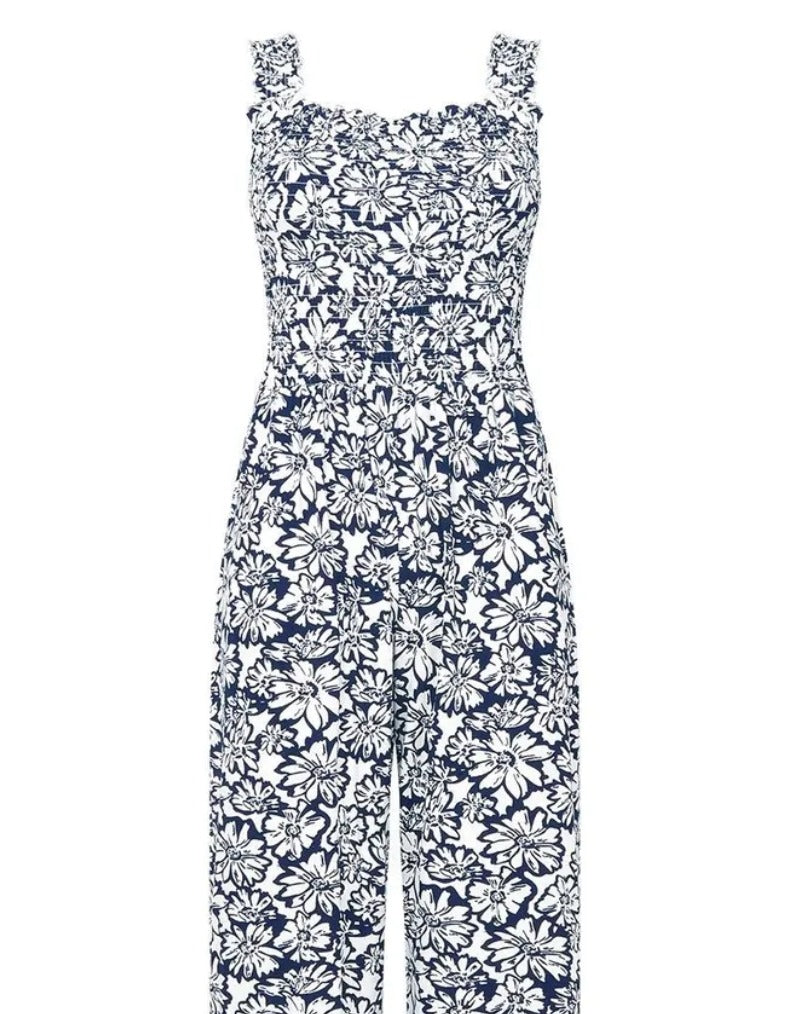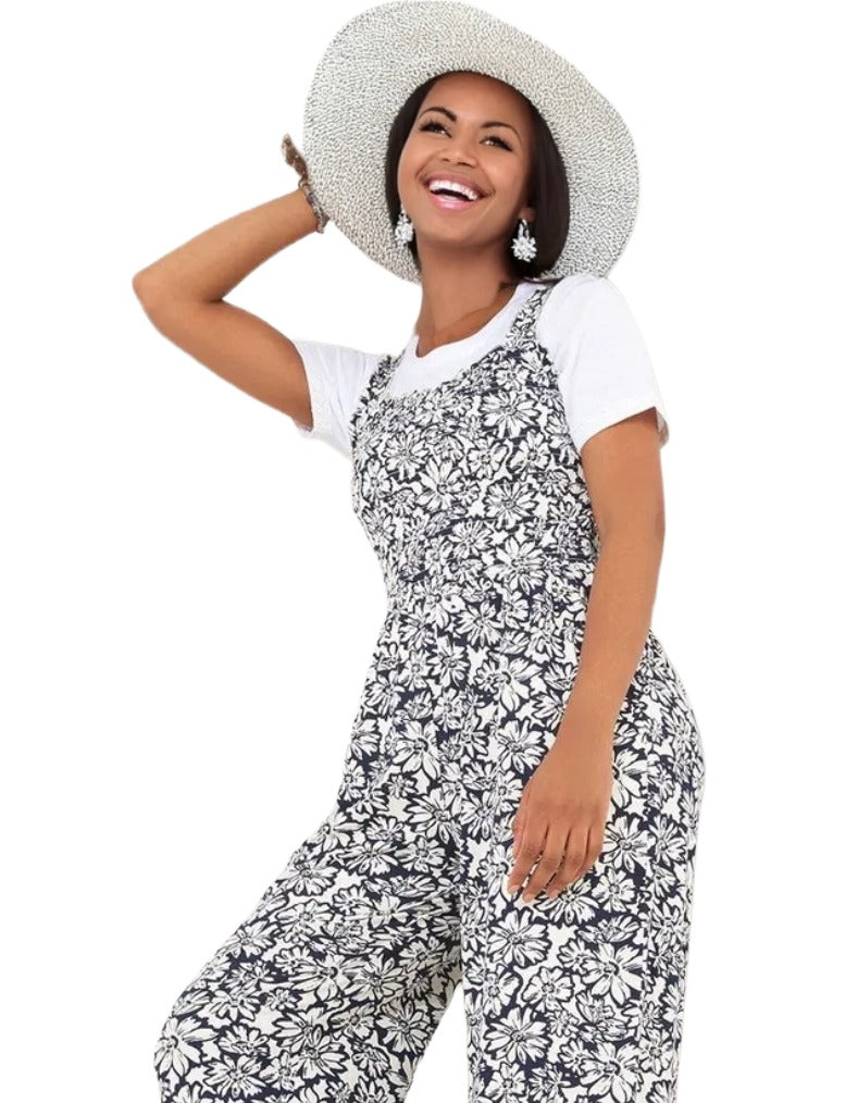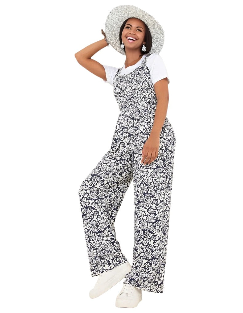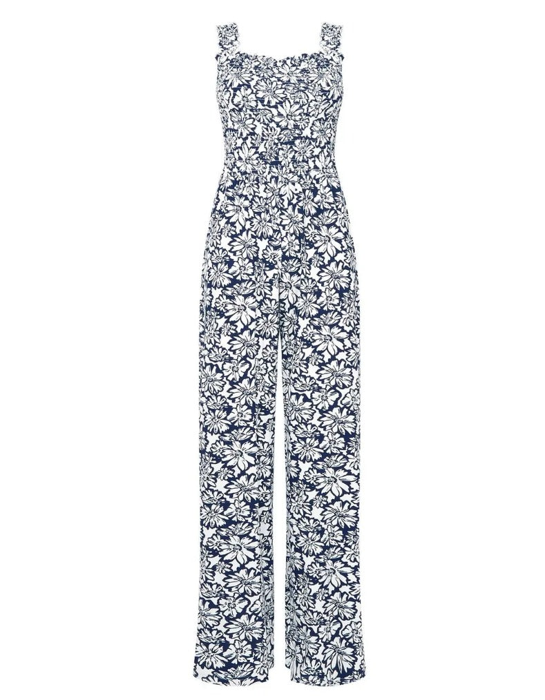 This women's monochrome floral jumpsuit in navy features elasticated shoulder straps and a fitted bodice for a flattering silhouette. Crafted from soft jersey fabric, it offers comfort and style, while the wide-leg design and bold print provide effortless summer elegance.