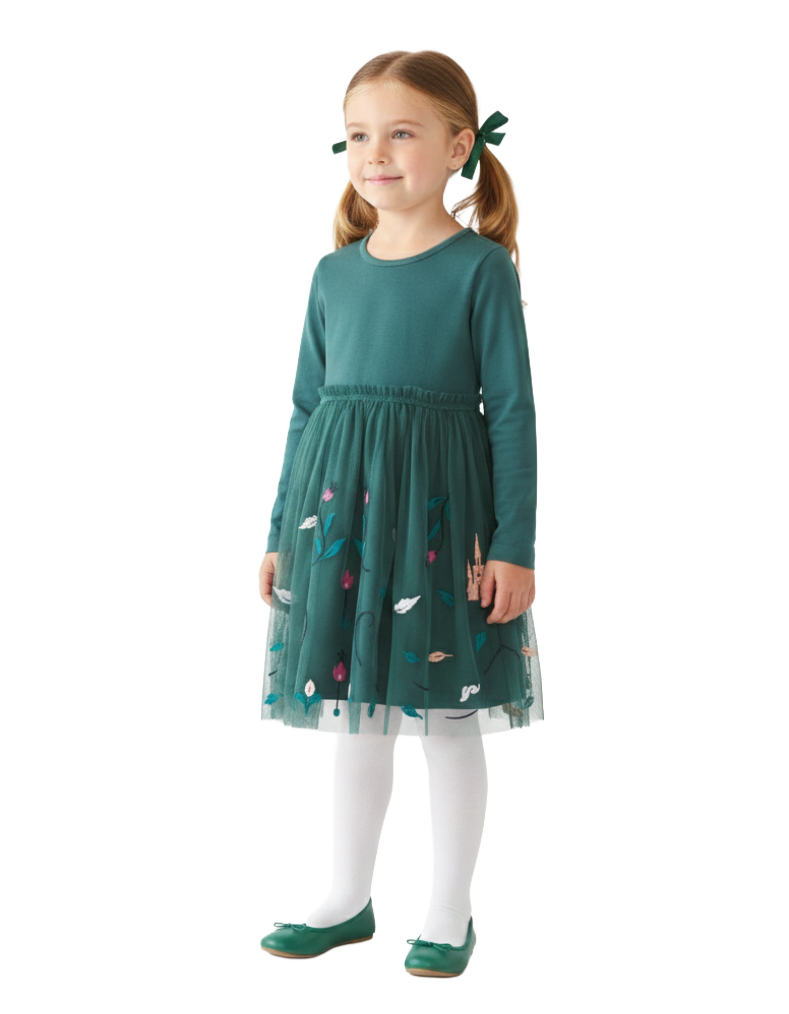 Girl's Hanna Inspired Novelty Tulle Dress in Frosty Green This charming tulle dress captures the essence of beloved character-inspired fashion with its thoughtfully designed silhouette. The dress features a comfortable jersey bodice that provides ease of movement, paired with a voluminous tulle skirt in a sophisticated frosty green shade. Delicate appliqué embroidery adorns the design, adding refined detail and visual interest. The imperfect finish lends authentic character to this piece, making it an ideal choice for special occasions, dress-up play, or everyday wear that celebrates individuality. A versatile wardrobe essential that combines comfort with distinctive style.