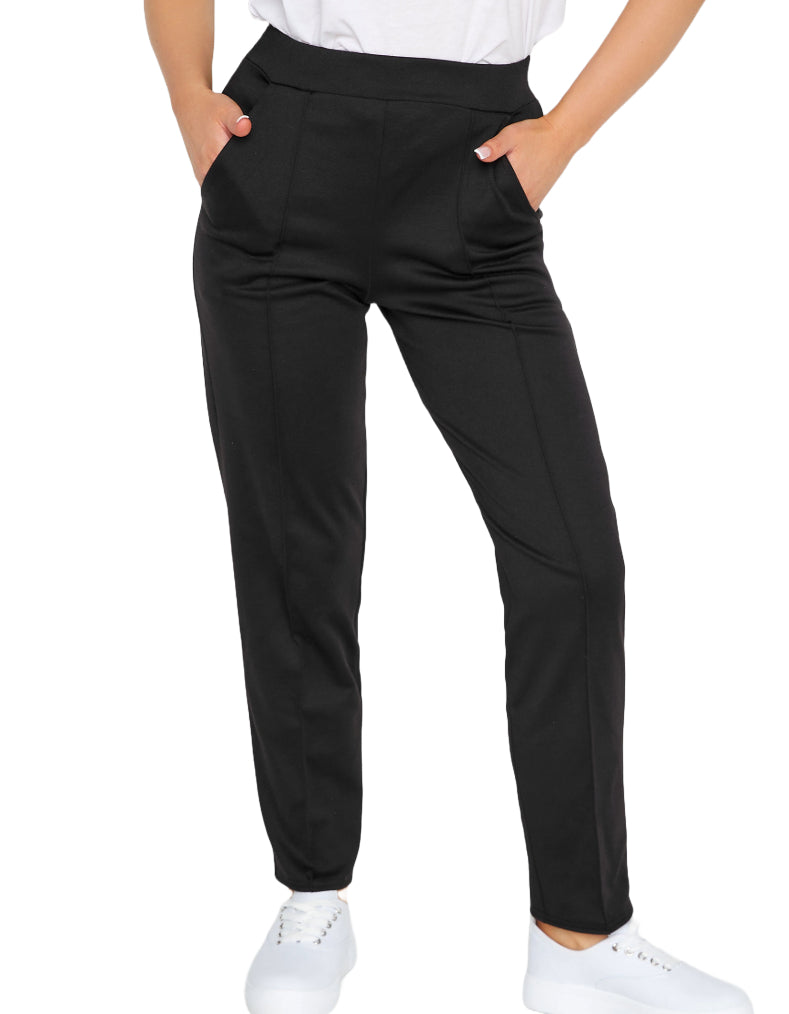 These Women's Pintuck Ponte Trousers in black offer a comfortable stretch jersey fabric with an elasticated waistband and pintuck detailing. Designed for easy pull-on wear, they feature two side pockets and pair perfectly with a blouse and loafers for a polished office look.