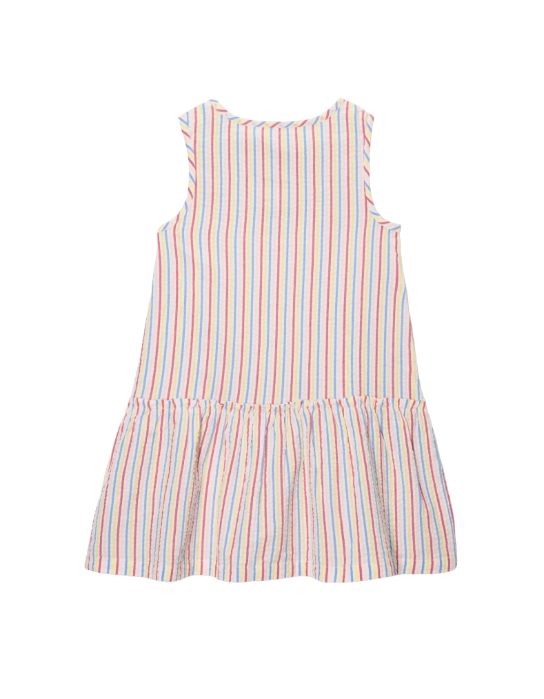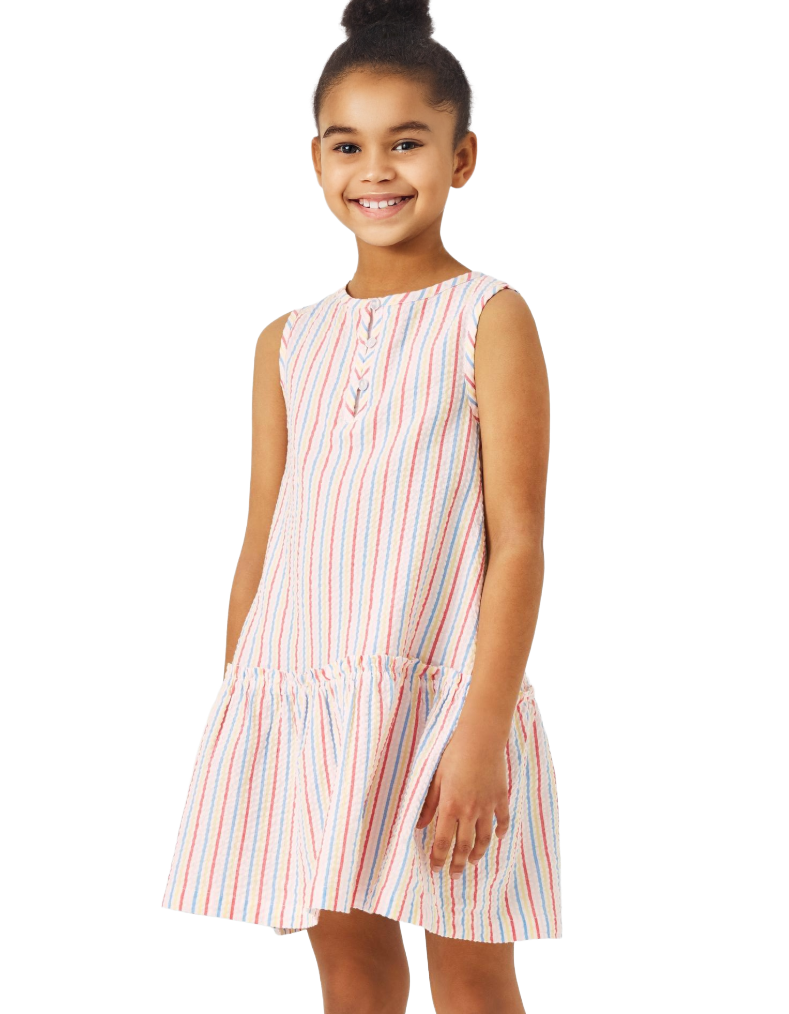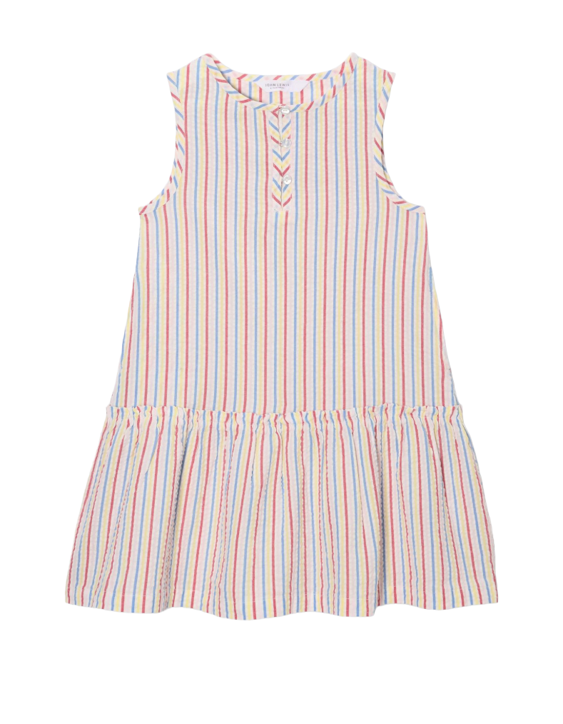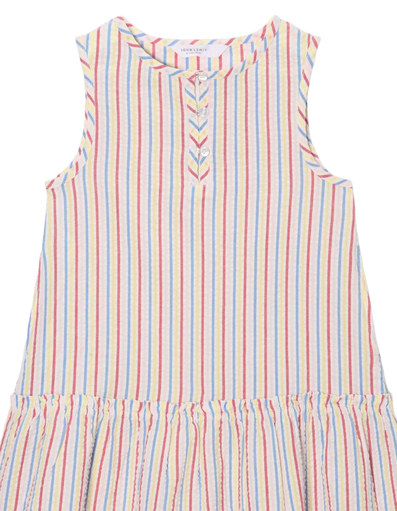 This John Lewis Girl's Sleeveless Stripe Tiered Hem Dress in Multi is crafted from soft, breathable cotton, ideal for staying cool during warm weather. Its sleeveless design and tiered ruffle hem add playful elegance, making it both comfortable and stylish for everyday wear or special occasions.