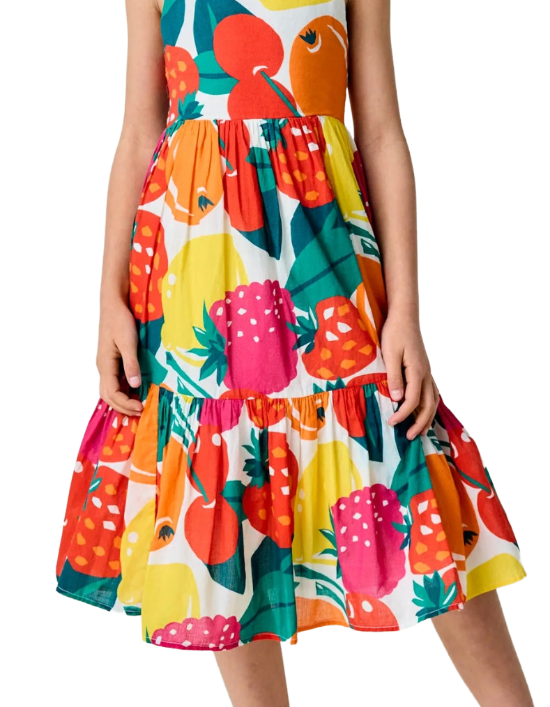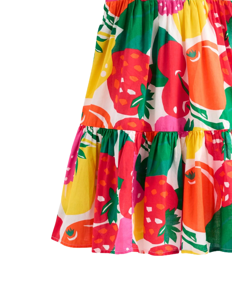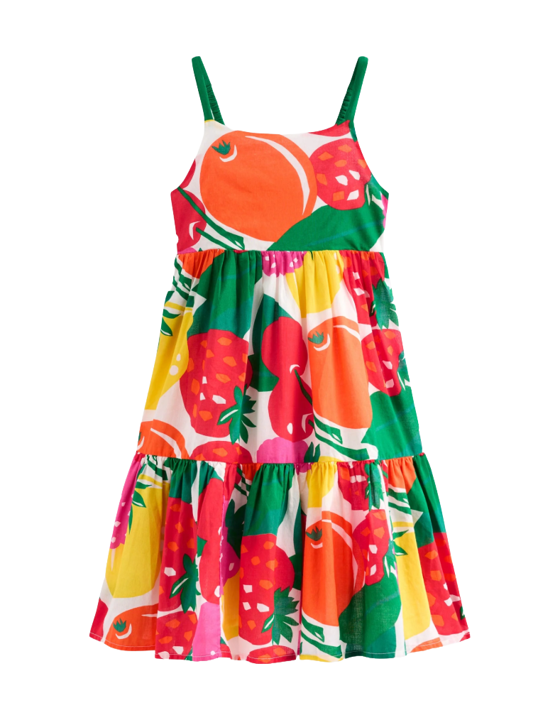 The Mini Boden Girl's Aurelia Tiered Twirly Dress in Multi Giant Fruit is designed for active little ones who love to move freely. Featuring thin stretchy straps and a shirred back panel, it ensures a comfortable fit that adapts to every twirl and spin. The playful tiered skirt showcases a vibrant giant fruit pattern, making it a delightful choice for everyday wear or special occasions. Durable yet soft, this dress offers both style and ease of movement for your child’s busiest days.