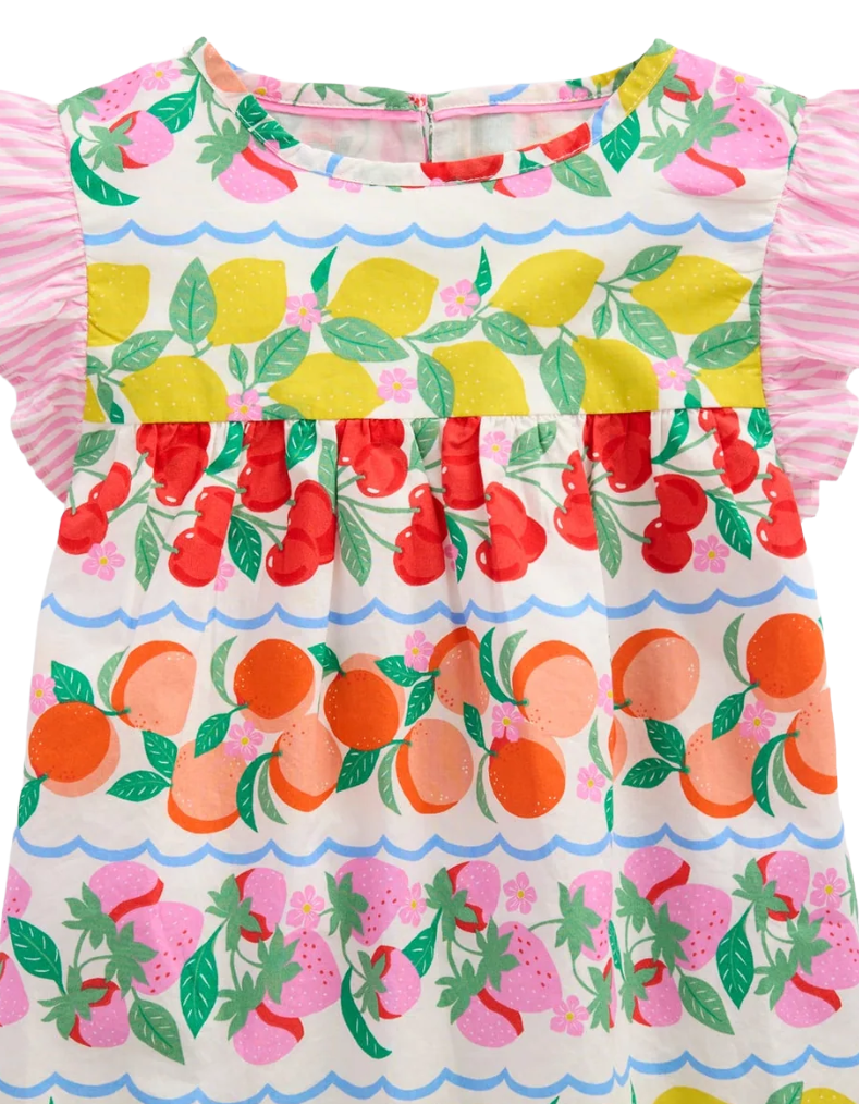 Crafted from lightweight cotton, the Mini Boden Girl's Frill Sleeve Woven Top in Rainbow Fruit Stripe offers breathable comfort ideal for everyday wear. Its delicate stitch detailing and frilly hems add refined charm, making it a stylish yet practical choice for layering or standalone use..