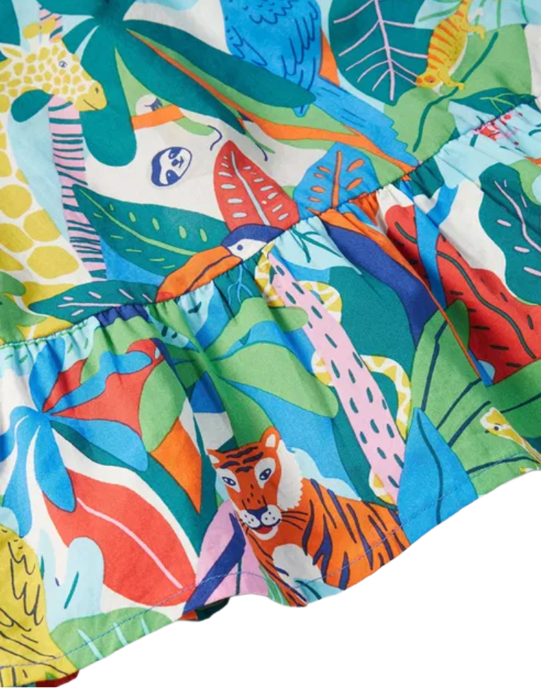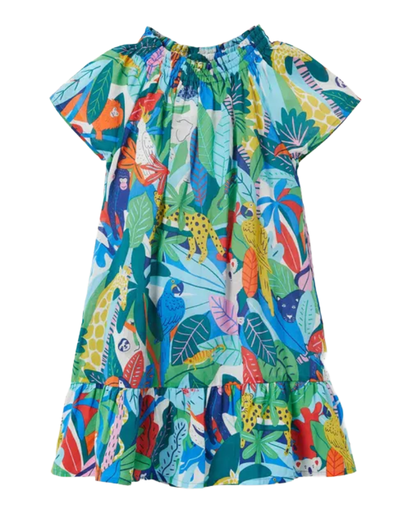 The Mini Boden Girls' Tropical Printed Smocked Kaftan Dress combines comfort and style with its lightweight 100% cotton fabric, ideal for everyday wear. Featuring a smocked neckline and ruffled sleeves, this above-knee dress offers both a flattering fit and playful charm. Its vibrant multicolour design adds a cheerful touch, while machine washability ensures easy care and durability. Perfect for warm days, this dress balances breathability and fashion effortlessly.