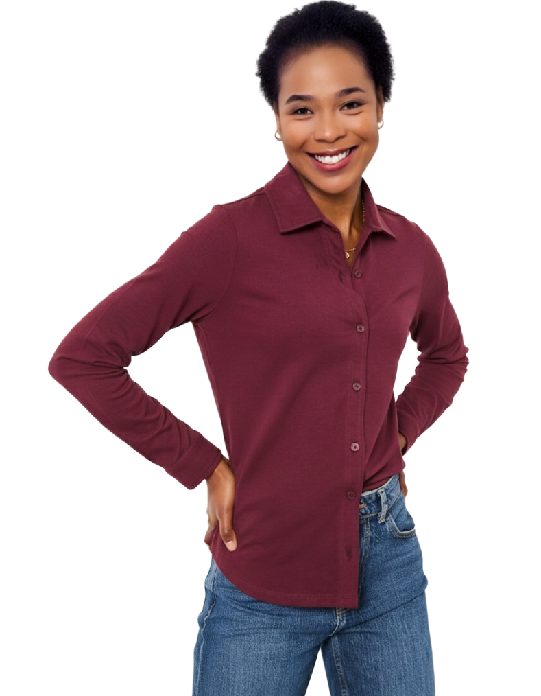The Women's Selby Cotton Jersey Shirt in Burgundy combines everyday comfort with refined versatility. Crafted from soft, breathable cotton jersey, this piece moves seamlessly from professional settings to casual outings. The classic regular collar and adjustable long sleeves ensure a tailored silhouette that adapts to your preferences. Layer it over basics for understated elegance, or wear it standalone for relaxed sophistication. An essential wardrobe staple that transcends occasion and season.