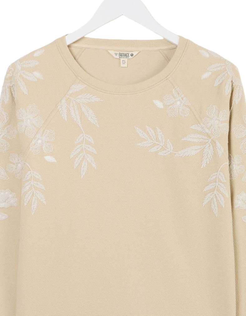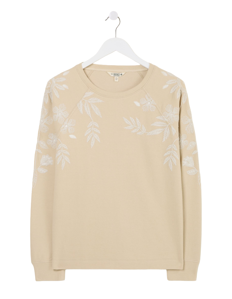 This Women's Ellie Natural Embroidered Crew Sweatshirt in Ivory is crafted from 100% cotton, offering exceptional softness and breathability. Its relaxed fit and classic crew neckline deliver a comfortable, timeless silhouette. Featuring detailed flower and leaf embroidery, it adds subtle sophistication to casual outfits. Ideal for cosy weekends or casual outings, it pairs effortlessly with jeans or layers over a shirt for a refined touch. This sweatshirt is a versatile wardrobe essential, combining quality craftsmanship with elegant design.