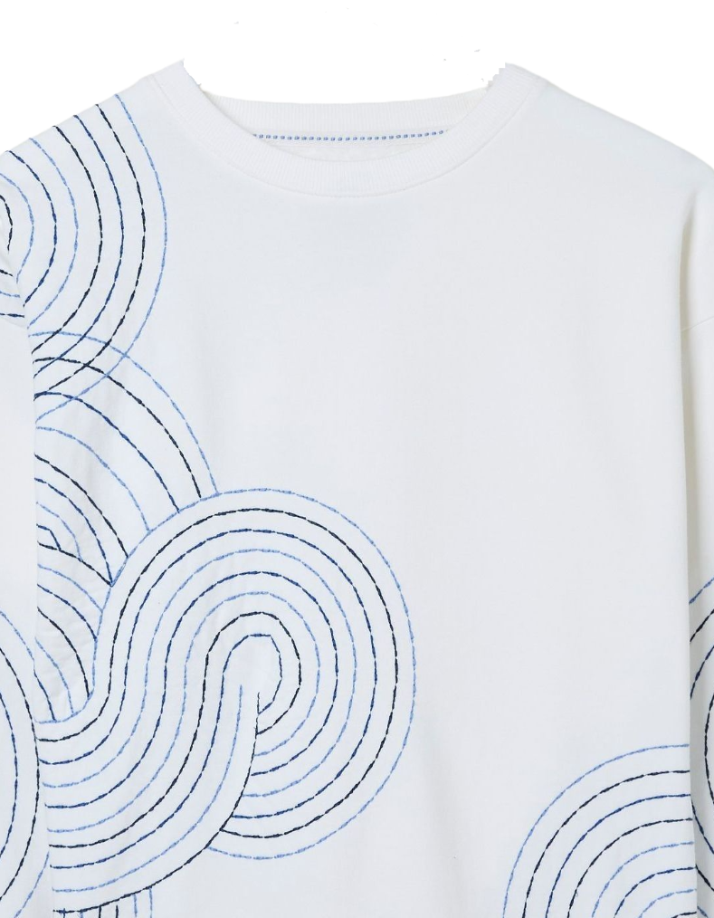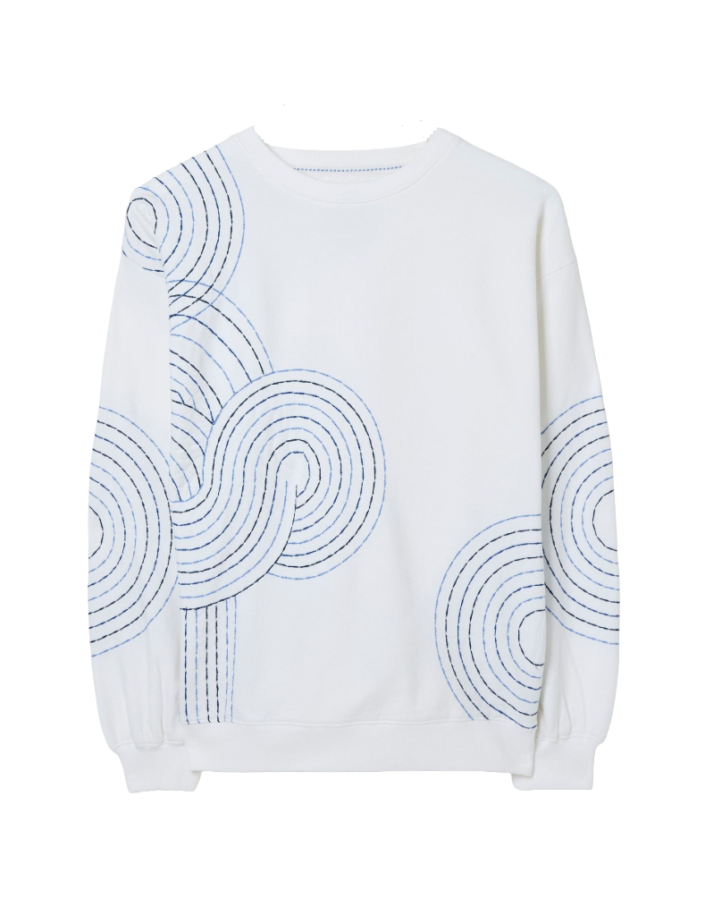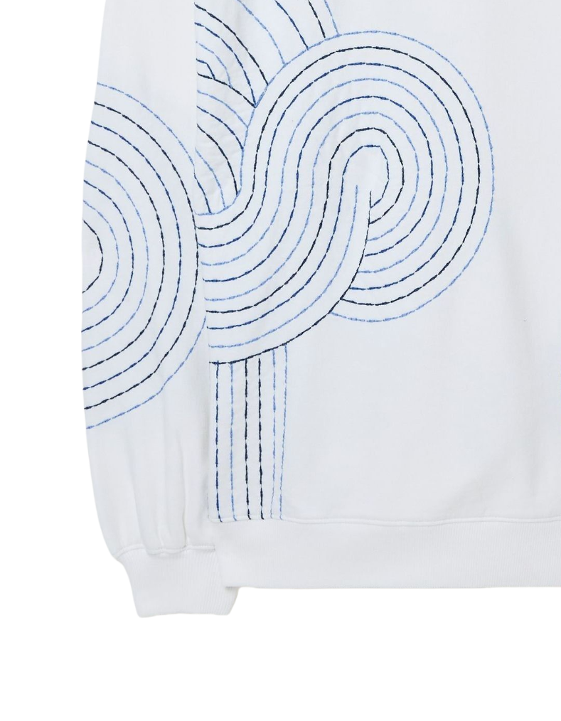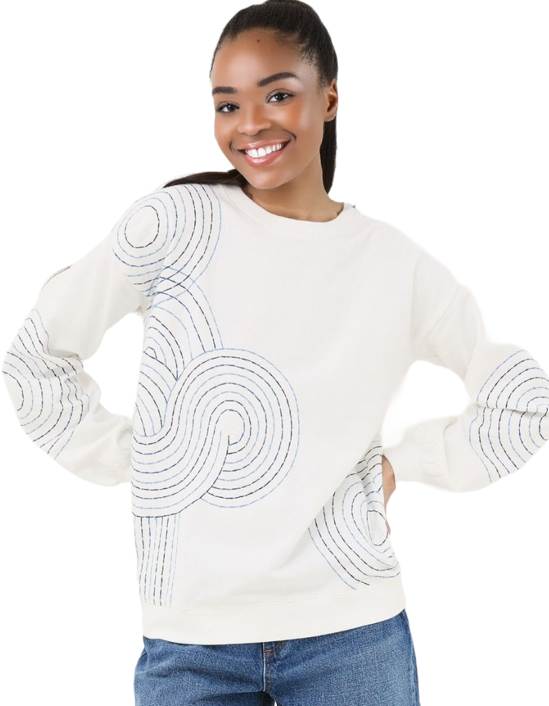 Experience effortless comfort with the Women's Long Sleeve Alex Natural Embroidered Sweatshirt in White. Designed for a relaxed fit, this supersoft sweatshirt features an elegant embroidered pattern inspired by ocean tides, adding subtle texture and charm. Ideal for pairing with denim or shorts, it offers a versatile, laid-back style perfect for everyday wear.
