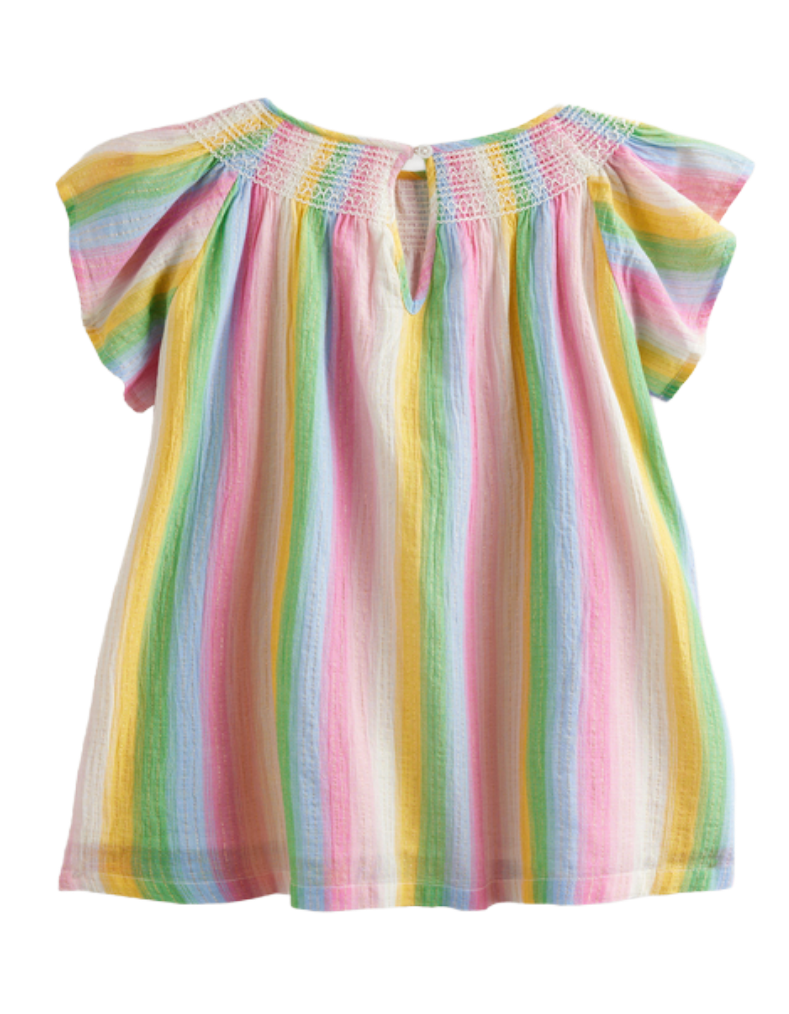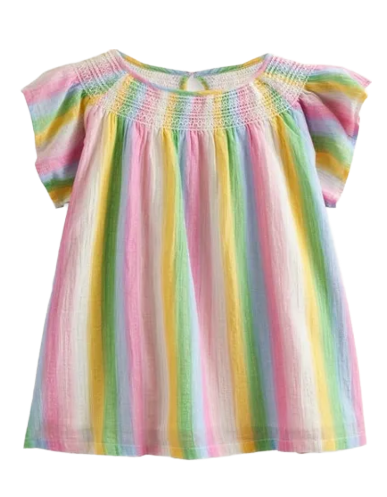 This Mini Boden Girls Frilly Woven Smocked Top in Blossom Pink features a full, floaty design enhanced by delicate flutter sleeves and detailed smocking across the chest. Crafted for both style and comfort, it pairs effortlessly with leggings or cycle shorts, creating an adorable yet practical outfit ideal for everyday wear.