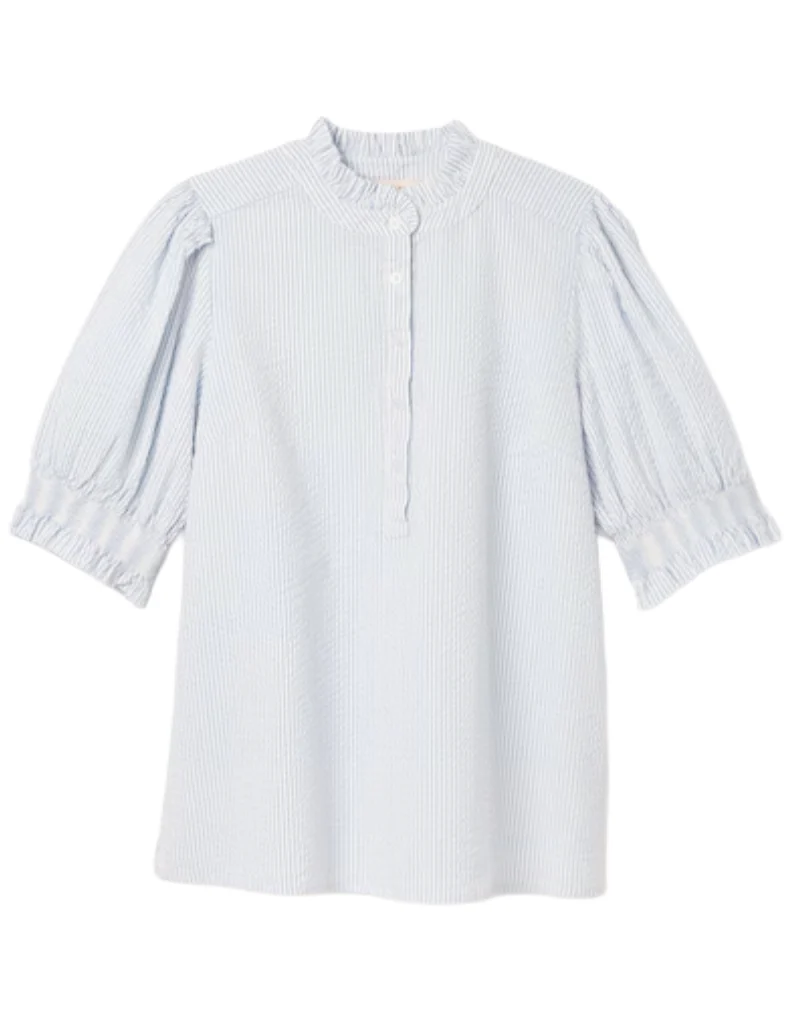 Crafted from a breathable cotton blend, the Women's Elle Blue & White Striped Frill Button-Up Blouse offers a refined yet relaxed silhouette perfect for spring and summer. Its elbow-length puff sleeves with elasticated frilled cuffs provide subtle volume and comfort, while the frilled pie crust neckline adds a delicate touch of elegance. The front button placket allows versatile styling, whether buttoned up for a polished look or left slightly open for casual ease. This blouse combines timeless detail with effortless wearability.