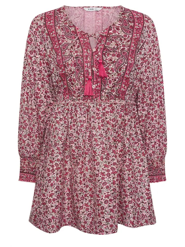 This bohemian peasant blouse embodies relaxed elegance through its breathable woven construction and intricate floral paisley print. Long cuffed sleeves and a distinctive tassel tie detail define the design, while the generous longline cut ensures comfortable, unrestricted movement. The versatile silhouette transitions seamlessly from layered styling to standalone wear, making it an essential piece for warm-weather wardrobes. Pair with shorts and sandals for an effortlessly curated look that balances comfort with refined aesthetic appeal.