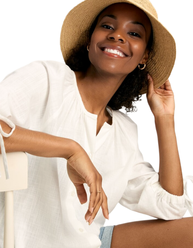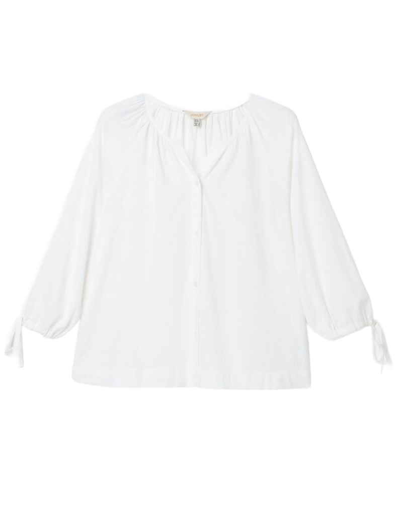The Sylvie blouse combines effortless elegance with practical summer styling. Crafted in crisp white, this notch neck design features distinctive tie cuffs on three-quarter sleeves that add a refined finishing touch. The relaxed fit ensures comfort throughout warm weather, while the structured fabric maintains its shape. Perfect for layering or wearing solo, this versatile piece transitions seamlessly from office to weekend occasions. A timeless wardrobe essential that delivers both sophistication and wearability.