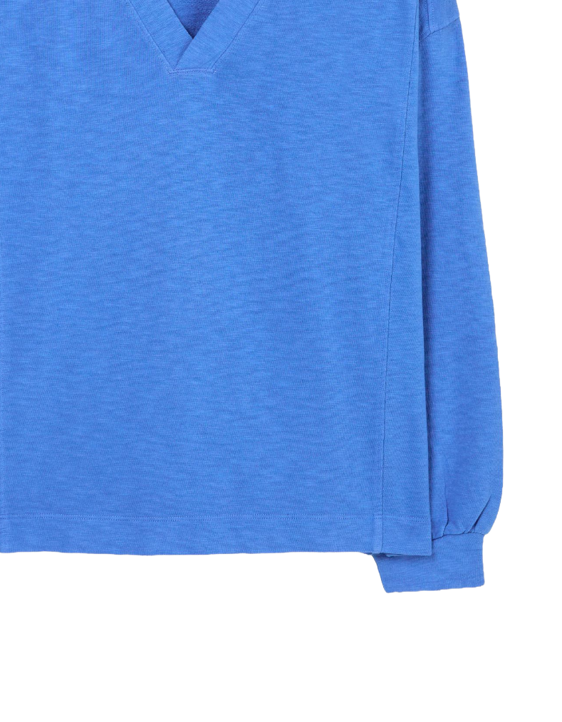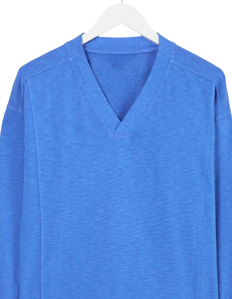The Gigi V-neck sweatshirt delivers understated sophistication through its thoughtfully designed silhouette. Constructed entirely from premium cotton, this piece offers exceptional breathability and a luxuriously soft hand-feel that improves with wear. The flattering V-neckline creates a refined aesthetic while maintaining the relaxed comfort essential for everyday wear. Whether layered over basics for structured styling or worn solo for effortless casual appeal, this sweatshirt transitions seamlessly from weekend errands to evening relaxation. Its versatile mid-blue tone pairs intuitively with denim, neutral trousers, or comfortable joggers, making it an indispensable foundation piece for any contemporary wardrobe.