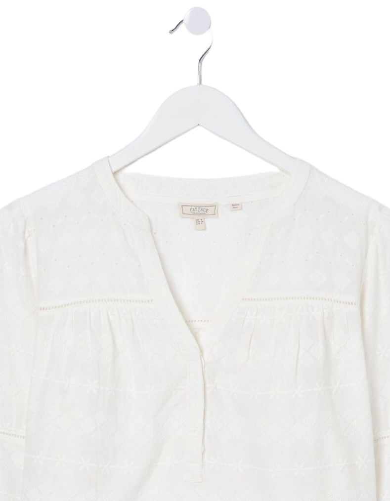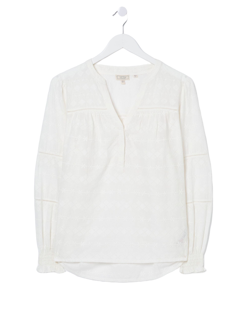 Introducing our Women's Natural Poppy Embroidered Blouse in Ivory. Made of 100% cotton, this blouse features delicate embroidery details that add elegance to the classic white shirt. The cuffed frill sleeves, concealed button-up half neck, and pointelle stitches make for standout details. Perfect for pairing with denim, cargo trousers, or skirts.