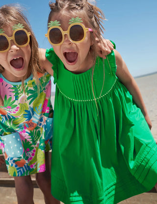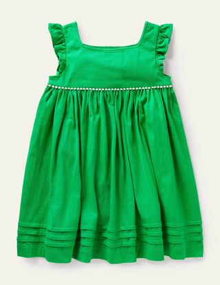 Our playful-and-practical dress is a perfect pick for warm-weather dressing. The comfortable square-necked top features neat pintucks and frilled sleeves, plus a cheerful pom-braid trim along the high waistline. Gathers in the skirt are the secret ingredient for spinnable fullness. Thanks to the cotton-jersey fabric, this is a hard-wearing style that feels supersoft. Choose from our selection of solid bright colours and detailed prints.