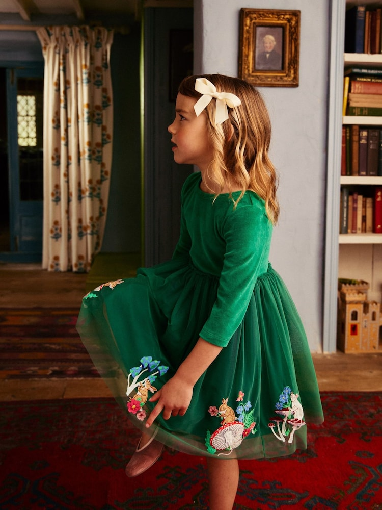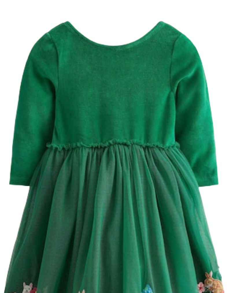 This Mini Boden girl's dress combines plush velvet with delicate tulle and intricate appliqués, creating an elegant look perfect for festive occasions. Its rich green hue and refined textures make it ideal for dancing and celebrations, ensuring comfort and style throughout the event.