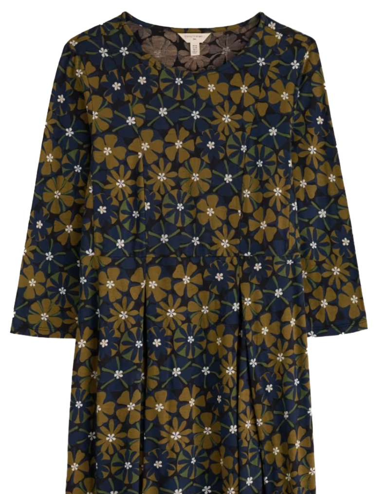 Crafted from organic cotton and TENCEL™ Modal, this Women's 3/4 Sleeve Witch Hazel Printed Jersey Dress combines sustainable materials with thoughtful design. The empire waistline and inverted pleats create a graceful A-line silhouette with a fuller skirt that lands at the knee, whilst 3/4 sleeves and a classic crew neckline offer versatile layering options. The handicraft flowers print in bright olive delivers seasonal appeal, making this piece an essential addition to your autumn wardrobe.