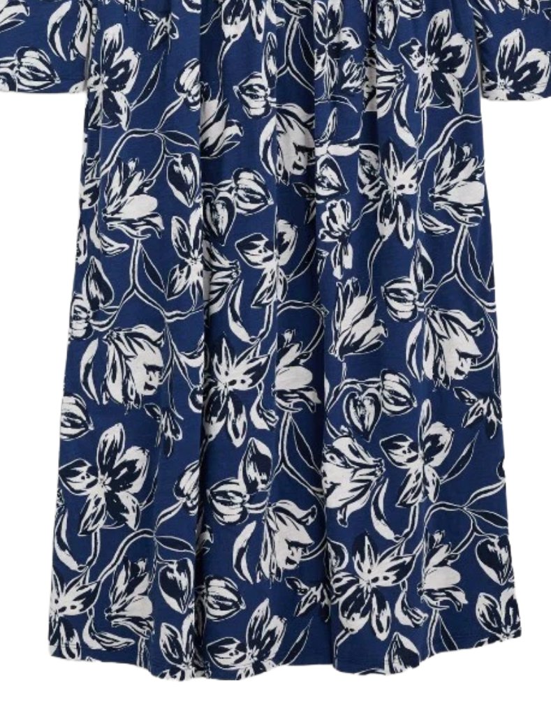 This Women's Cladonia Long Sleeve Jersey Dress in Navy Cyclamen combines comfort and style with its soft organic cotton fabric and classic boat neckline. The dropped waist with subtle gathers adds gentle volume to the skirt, enhancing its flattering silhouette. Thoughtfully designed with discreet side seam pockets, this dress offers practical elegance. Its versatile design makes it an effortless choice for both casual and more formal occasions.