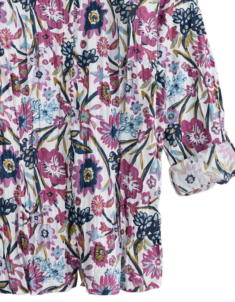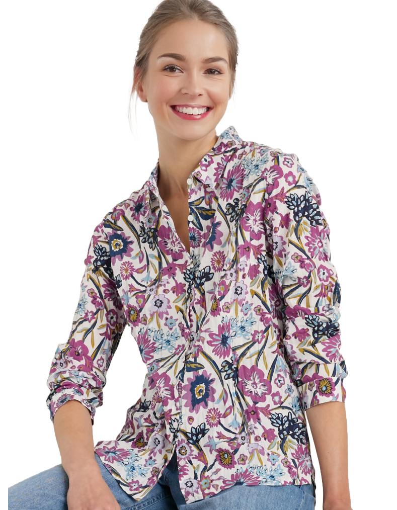 Introducing the Women's Cotton Larissa Shirt in Floral Terrain Chalk. Made from soft organic cotton with a casual crinkle, it's perfect for year-round wear. Save time on ironing - just wash and twist to maintain the crinkle! Featuring long sleeves and button loops, easily switch up your look. Available in a variety of beautiful prints by our talented textile designers.